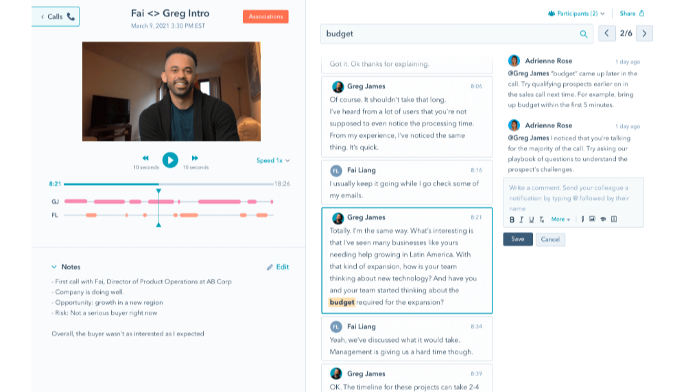 Prévisualisez les réunions sur les enregistrements associés et enregistrez et transcrivez automatiquement les réunions pour les lire. Dans la page d'index HubSpot, vous pouvez accéder à une liste complète des réunions de l'équipe, filtrer les réunions par propriétés d'objet et rechercher des termes clés dans les réunions.