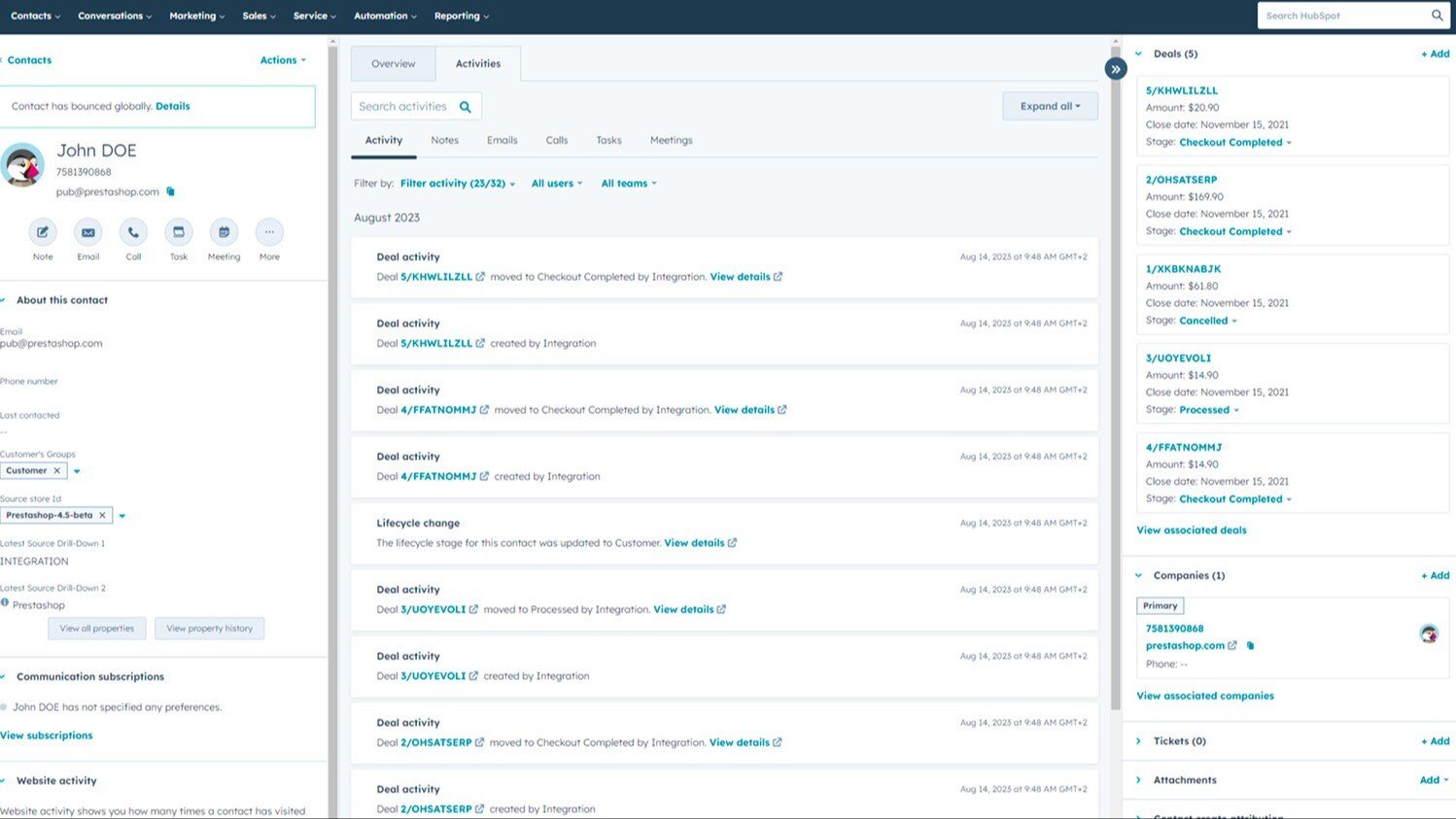 Synchronization of activity and contact information between Prestashop and HubSpot.