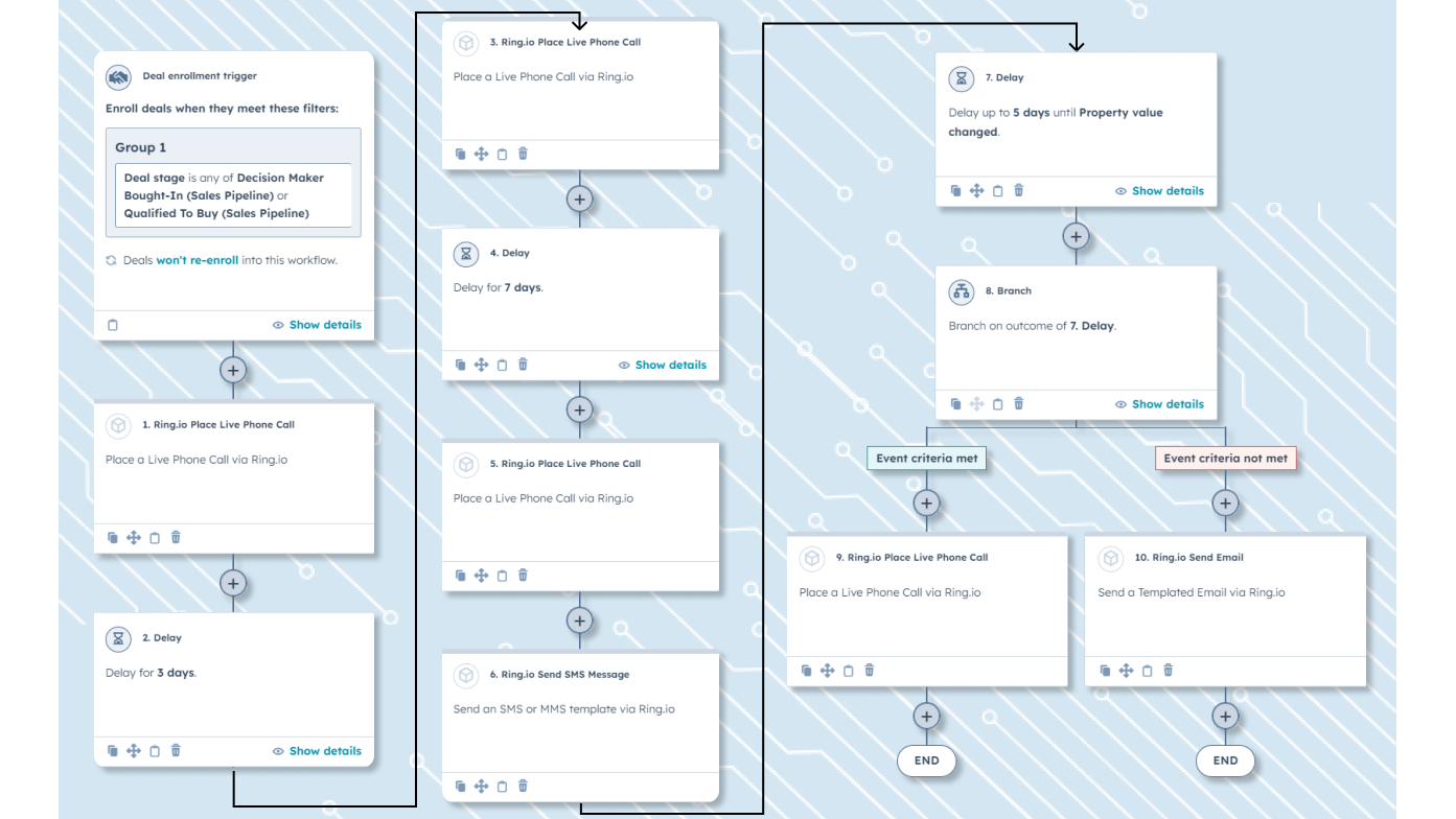 Automate your outreach seamlessly with HubSpot and Ring.io, enabling calls, SMS, and emails directly from HubSpot data for both simple and complex engagement strategies.