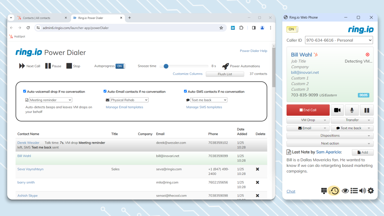 Power Dial / Text / Email right from within Hubspot: Say goodbye to the hassle of exporting and importing prospects. With Ring.io, your reps work directly in HubSpot with no need to export anything to another platform.