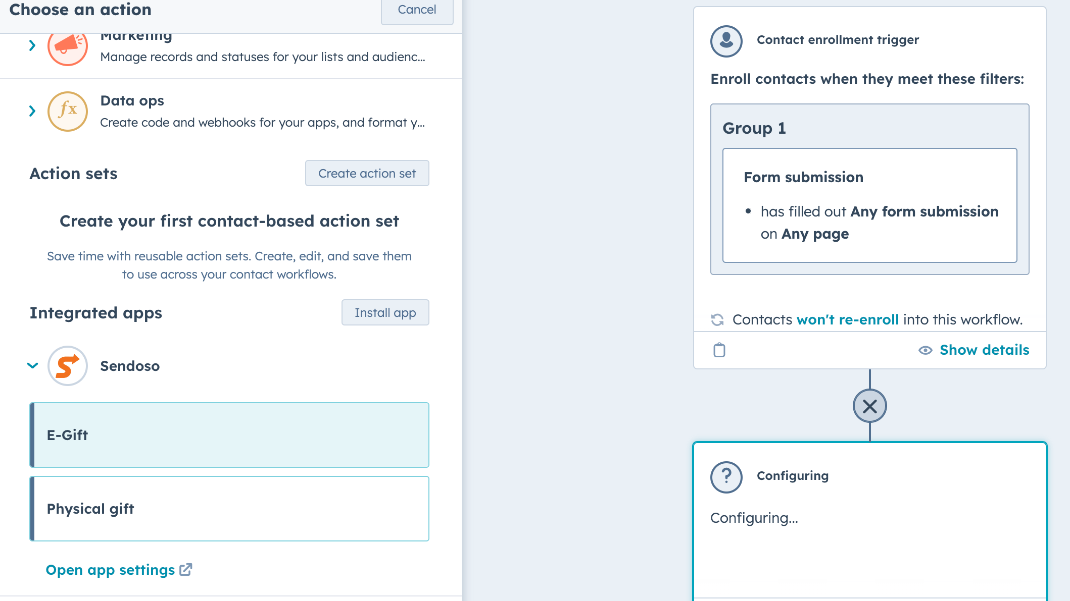 HubSpot customers have the ability to create an automated workflow in HubSpot Marketing Hub that will trigger eGifts and physical gifts to any of their contacts. Users simply create a new workflow and webhook that triggers the sending of the item(s) and Sendoso fulfills this request.
