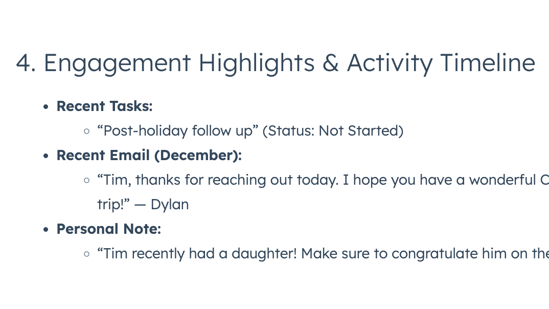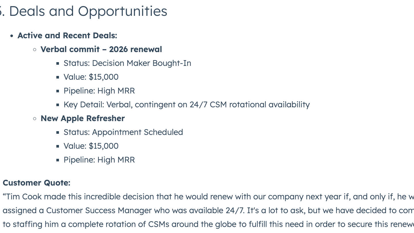 Preserving institutional knowledge. It automatically assembles every relevant conversation, deal update, ticket thread, and activity log so new owners start with the full backstory instead of guesswork.