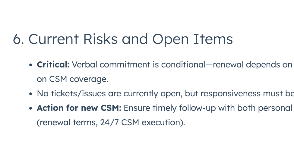 Accelerating ramp-up. Role-aware summaries surface the details each handoff role cares about (e.g., technical blockers for Solutions Engineers, renewal signals for CSMs), cutting ramp time from days to minutes.