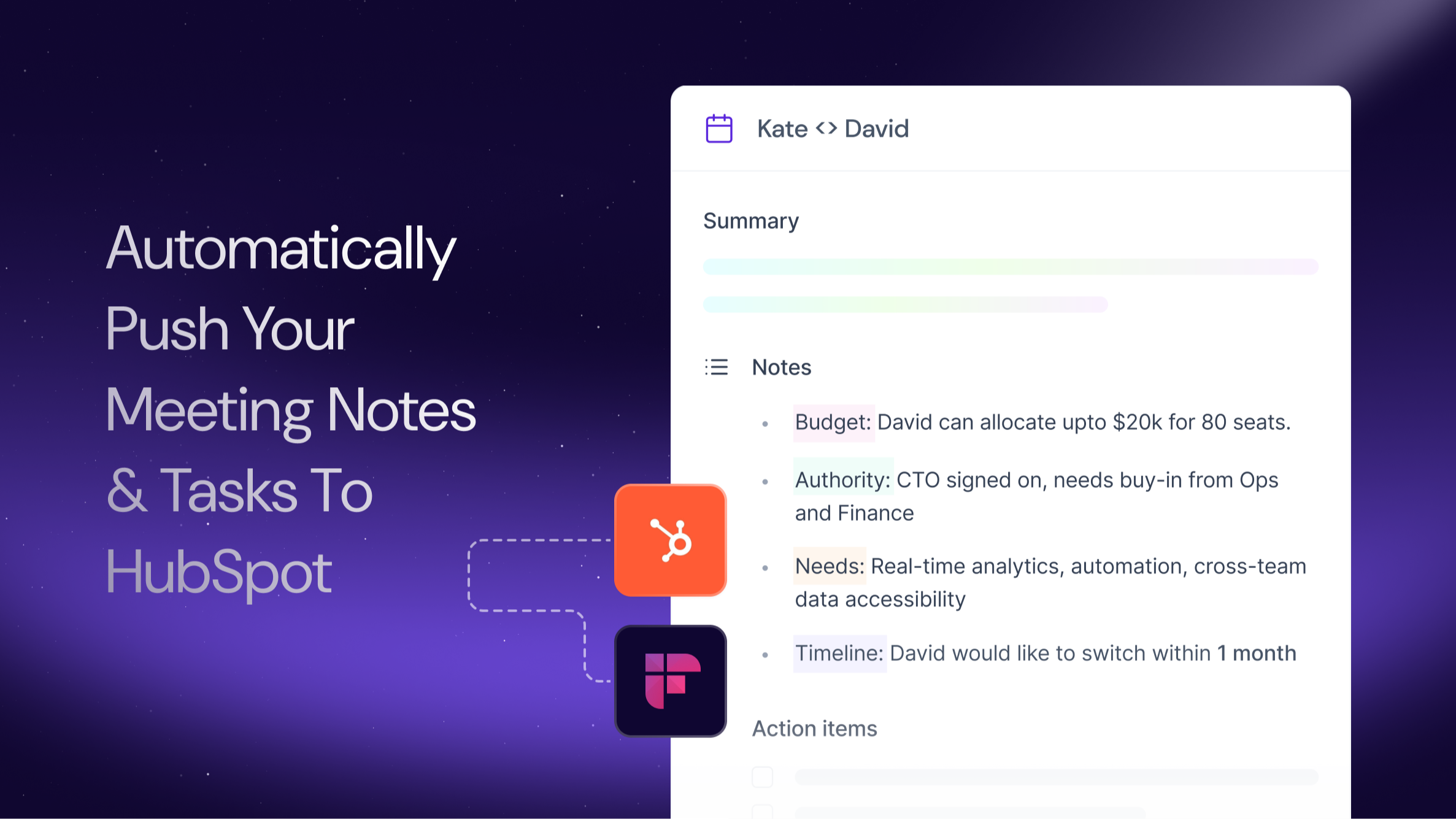 • Convert meeting action items into HubSpot tasks automatically, ensuring seamless follow-through on commitments