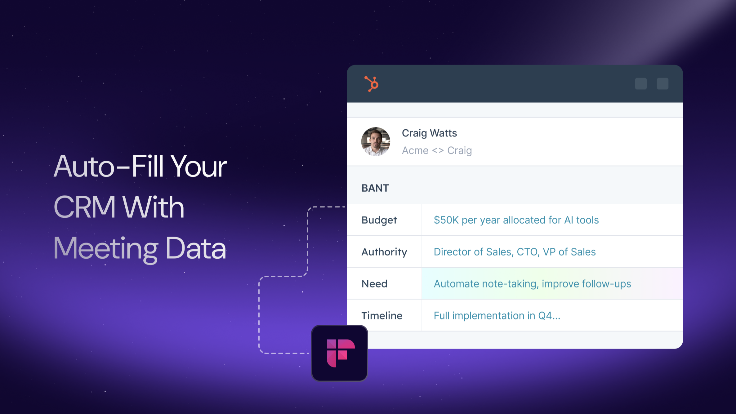Remove the guesswork and reduce manual effort with Fireflies' ability to instantly populate your HubSpot CRM with essential meeting data. From budgets and decision-maker details to key actionables, everything you need for effective follow-ups is captured in one place.