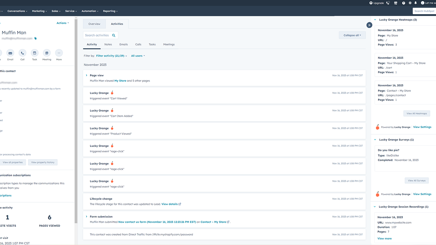 È qui che entra in gioco Lucky Orange. Abbinando Lucky Orange a HubSpot, potrete portare la storia del viaggio di ogni visitatore direttamente nel vostro CRM.