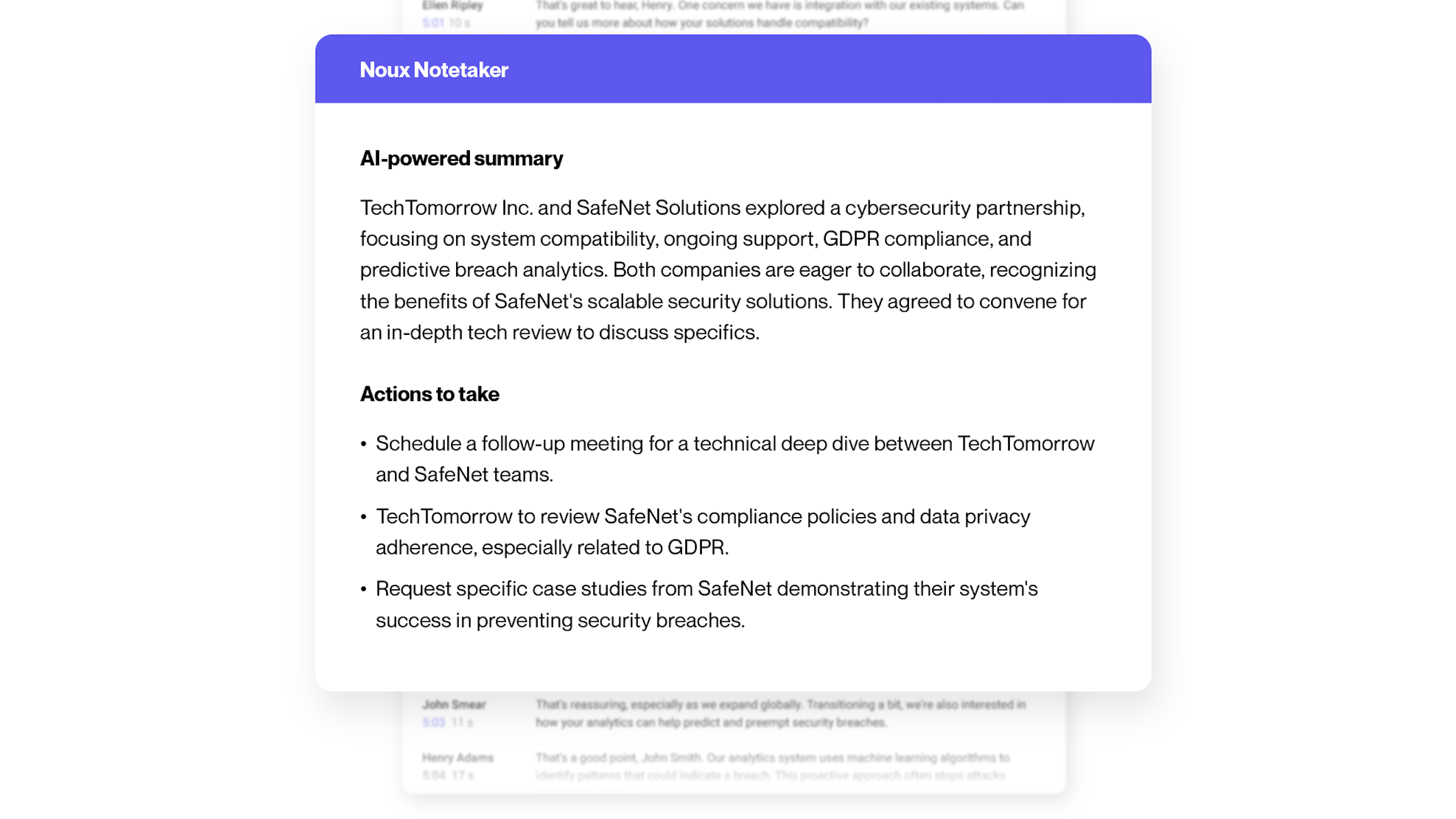 Get meeting notes instantly with AI-powered meeting notes. Noux Notetaker captures your sales discussions, generating insights, a full transcript, and a meeting summary—automatically sent as note to HubSpot deal.