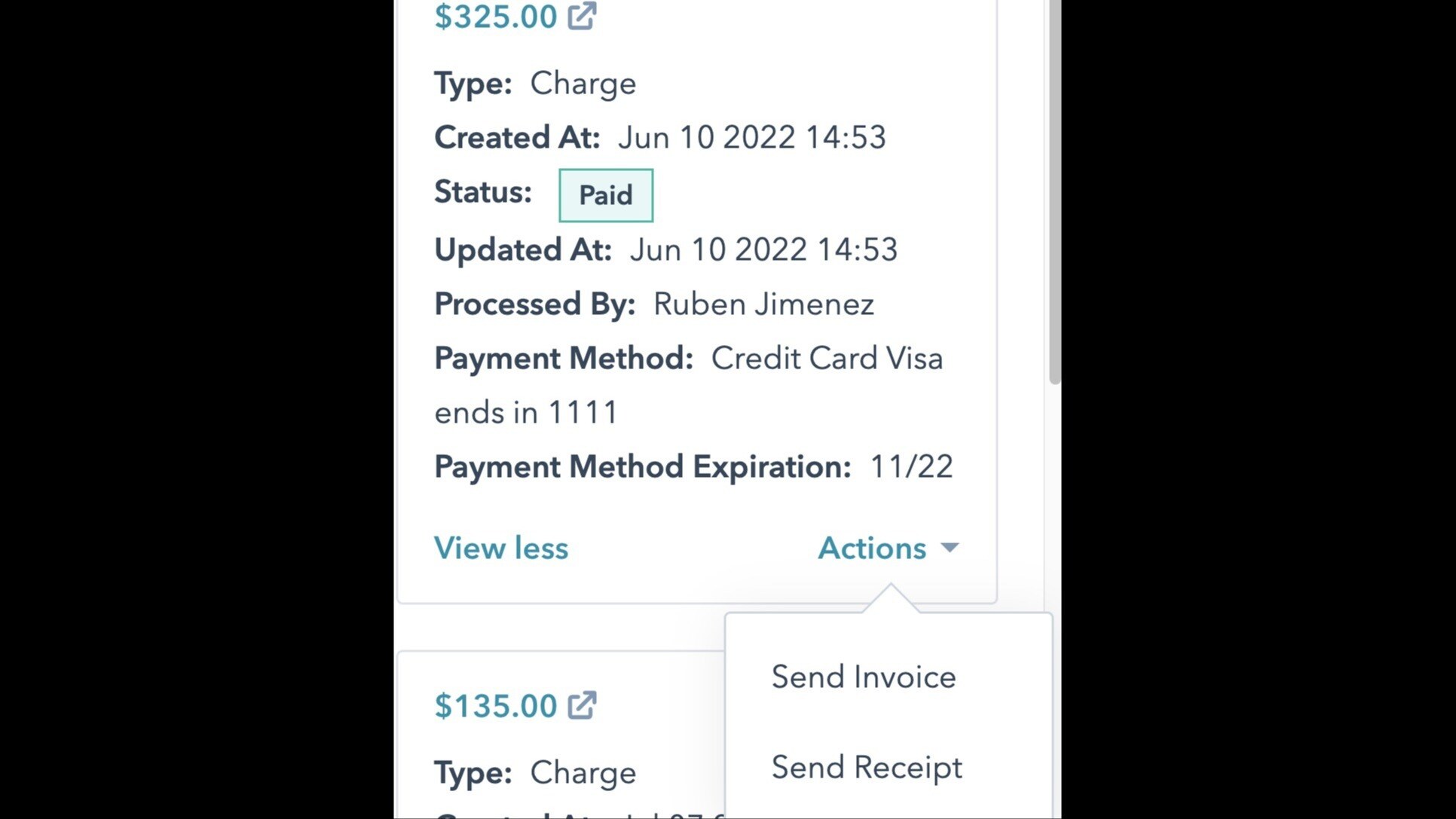 Enhance your HubSpot view with recent payment details. Access transaction information and perform key actions: send receipt, send invoice, or deep link to review and manage transactions directly. Streamline your workflow and improve customer interactions effortlessly.