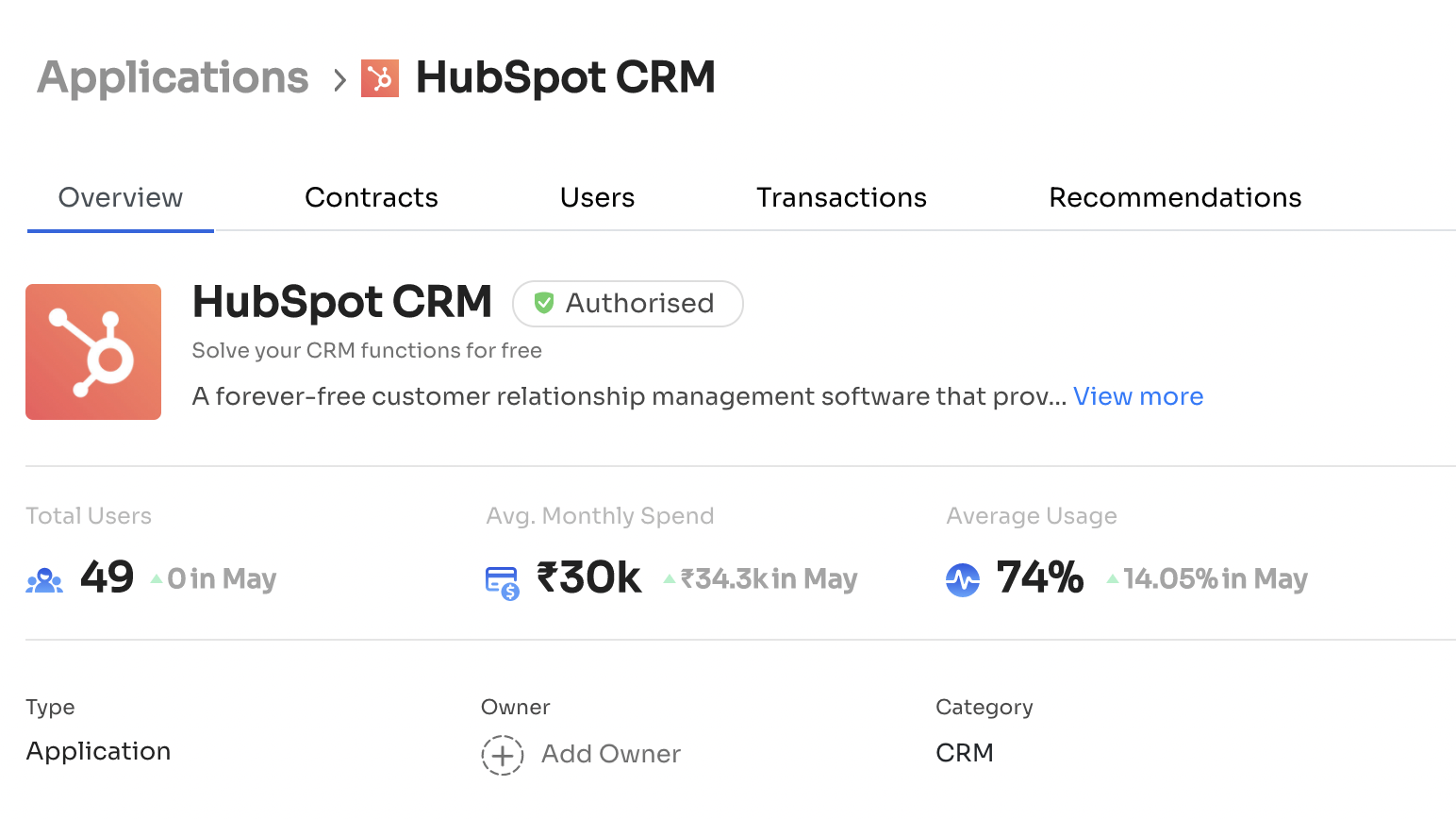 Zluri gives you detailed usage overview of HubSpot including number of users, total spend.