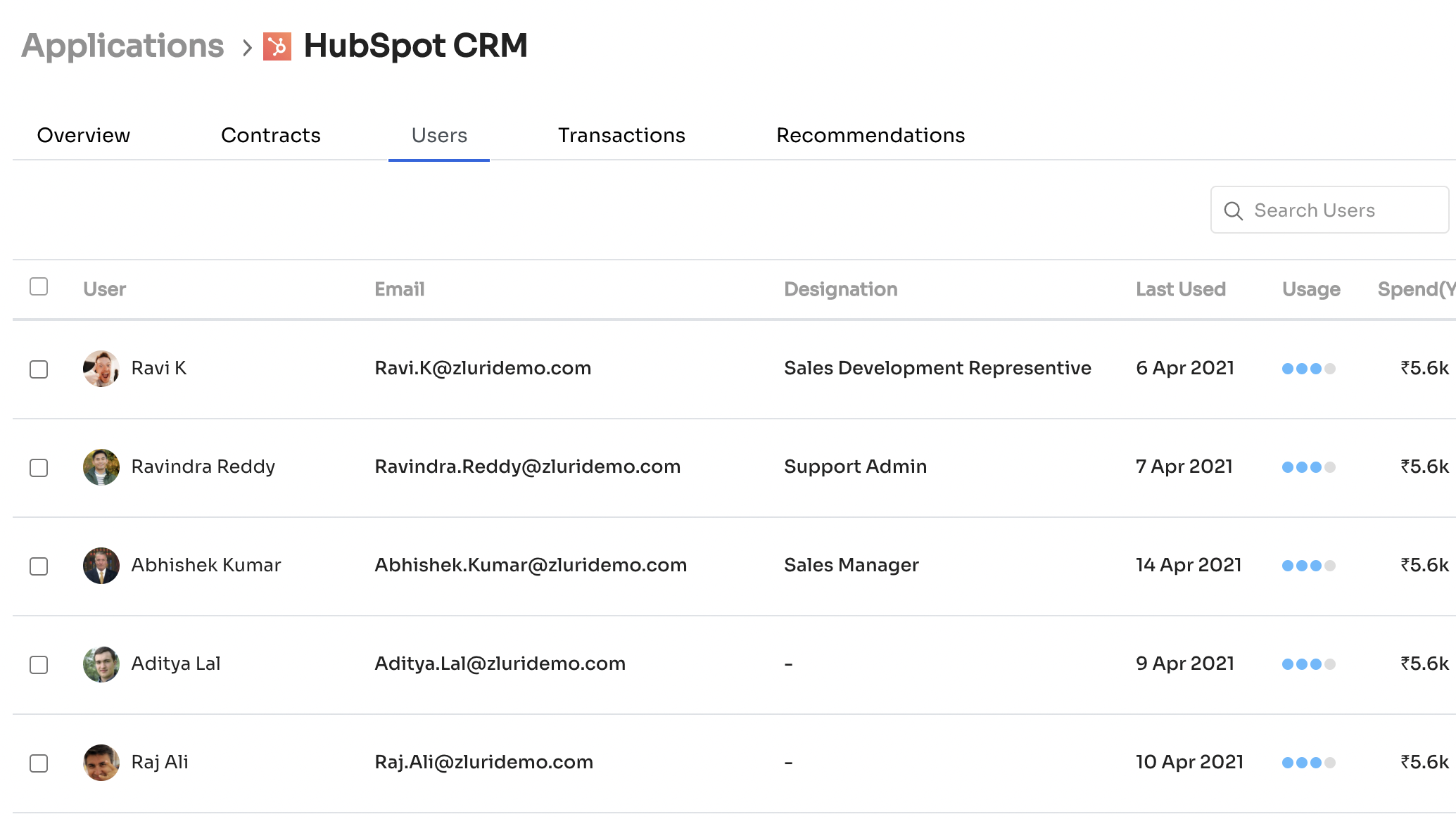 Zluri displays the list of HubSpot users & their frequency of use , last used date.