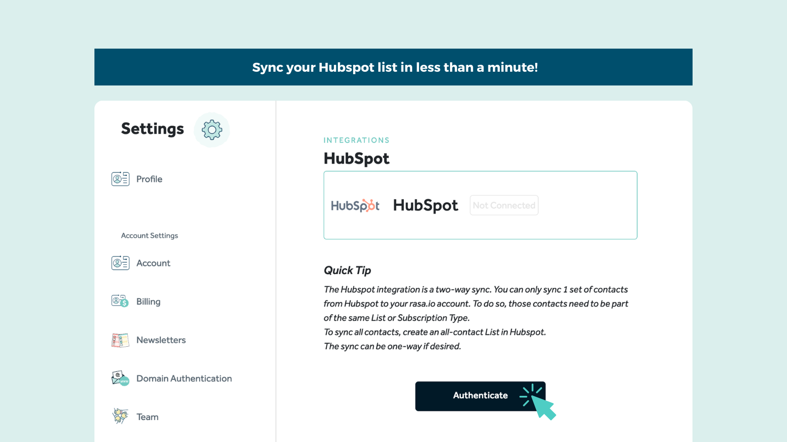Automatically sync your newsletter list and get your contacts flowing into rasa.io and HubSpot.