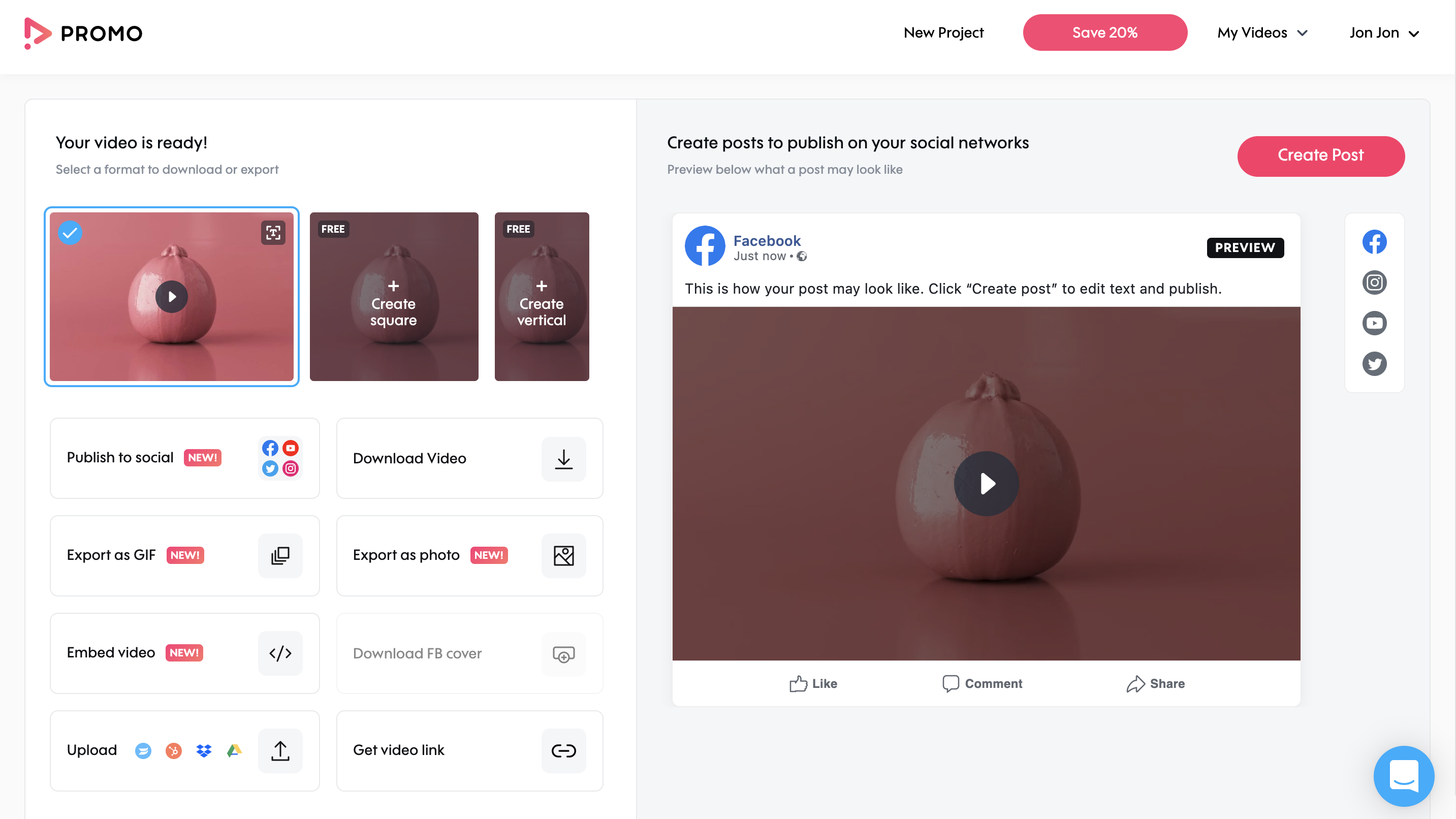 Promo.com helps you leverage great videos to promote anything they want online in smart, effective ways. Customize our award-winning templates, add your message and logo and you are done. With Promo.com you can create videos for all social channels and all your marketing needs.