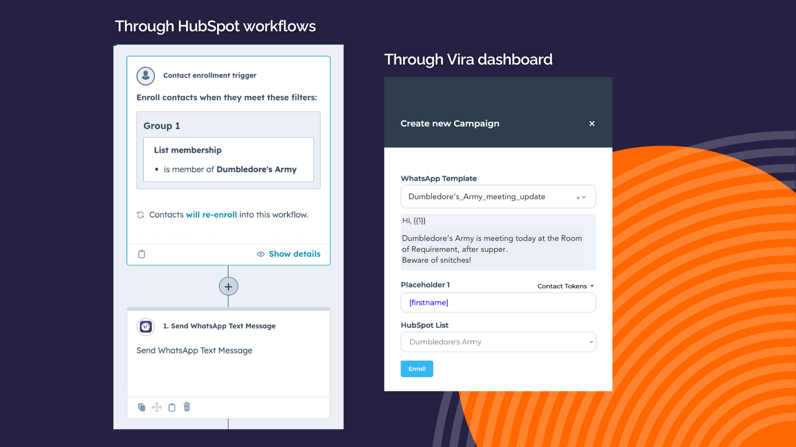 Viraを使えば、メタが承認したテンプレートを使って、HubSpotの連絡先リストにパーソナライズされたWhatsAppメッセージを一括送信できます。リストを選び、テンプレートを選択してキャンペーンを開始するだけです。 HubSpot ProまたはEnterpriseをご利用の場合は、ワークフローを使って送信を自動化できます。無料またはStarterの場合は、Viraのダッシュボードから直接送信できます。