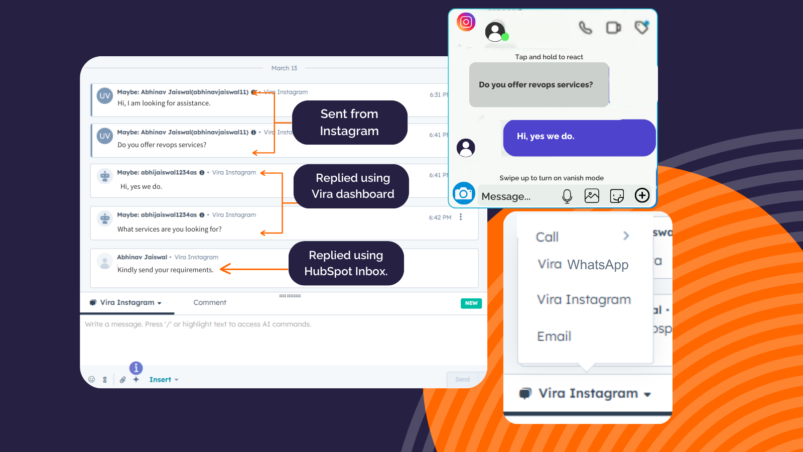 ViraはWhatsAppとInstagramの両方をHubSpot Inbox/Helpdeskとシームレスに統合できます。すべての顧客との会話を一元管理し、効率的な対応とチャネルをまたいだ合理的なコミュニケーションを実現します。