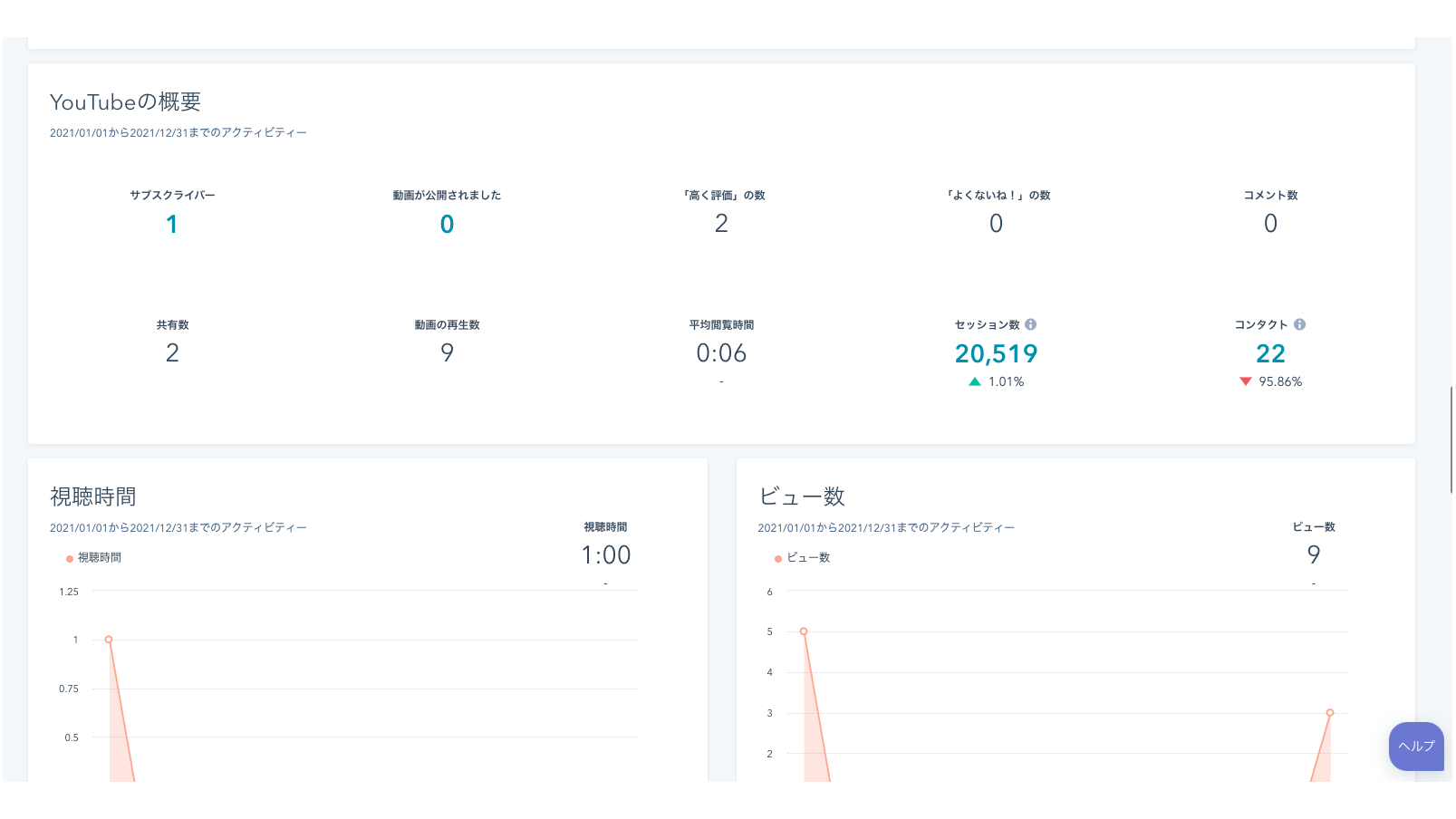 YouTubeのアカウントをHubSpotに接続することで、他に管理しているソーシャルキャンペーンやマーケティング活動と一元的にYouTube動画の成果を分析できます。どのような動画コンテンツに注力するかを検討するために、動画の全体的なパフォーマンスを把握したり、上位の動画を詳しく調べたりできます。YouTubeと他のソーシャルネットワークを比較して、オーディエンスのエンゲージメントが活発かどうかを確認することもできます。
