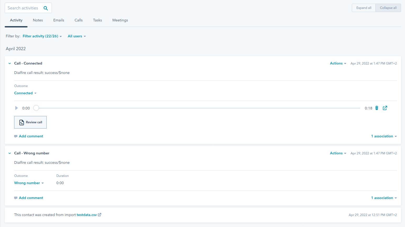 All calls made in Dialfire will be tracked in HubSpot's contact history. There you can also listen to your call recordings.
