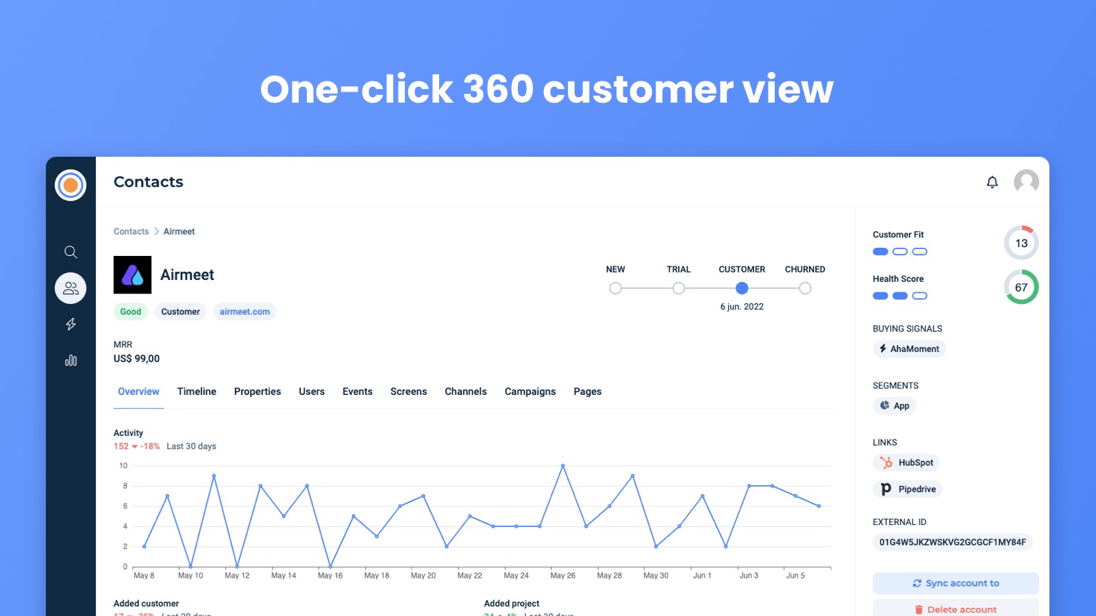 Simply add journy.io reference links to user and company records in HubSpot, and allow select account executives to discover complete customer journeys, including full timeline and all possible SaaS metrics. And you can also choose to continuously sync these metrics to HubSpot, making them actionable for email and other workflows.