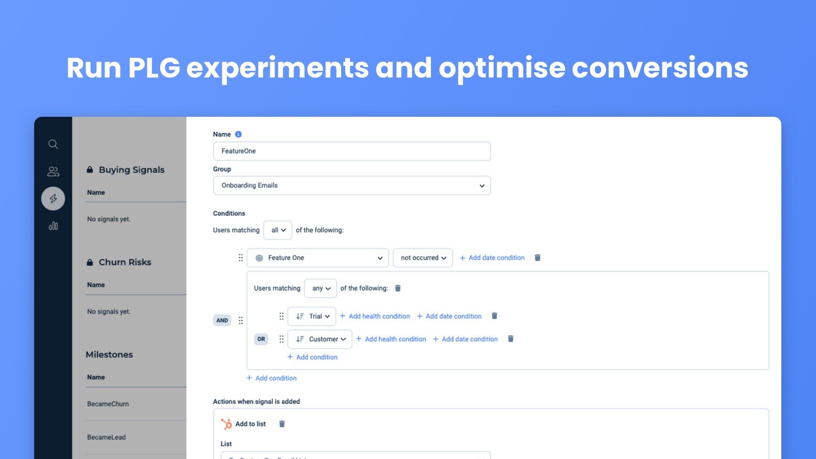 journy.io allows you to define product-qualified lead (PQL) signals with trigger playbook actions, such as pushing messages to Slack, sending notification emails, adding tags to ActiveCampaign and Mailchimp... and of course, automatically adding and removing PQLs to/from HubSpot lists, and adding engagement tasks for account executives.