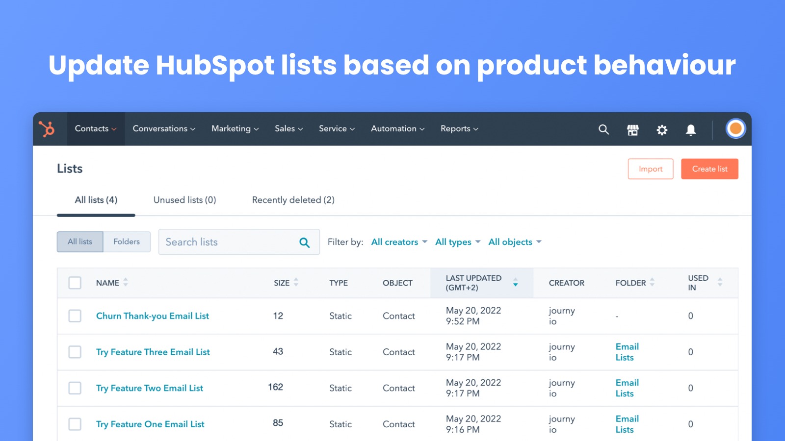 Let journy.io automatically add and remove users to/from HubSpot static lists, based on how they behave and progress on your SaaS platform. This could trigger personalised email workflows based on most important SaaS metrics, which are also available as actionable properties in HubSpot.