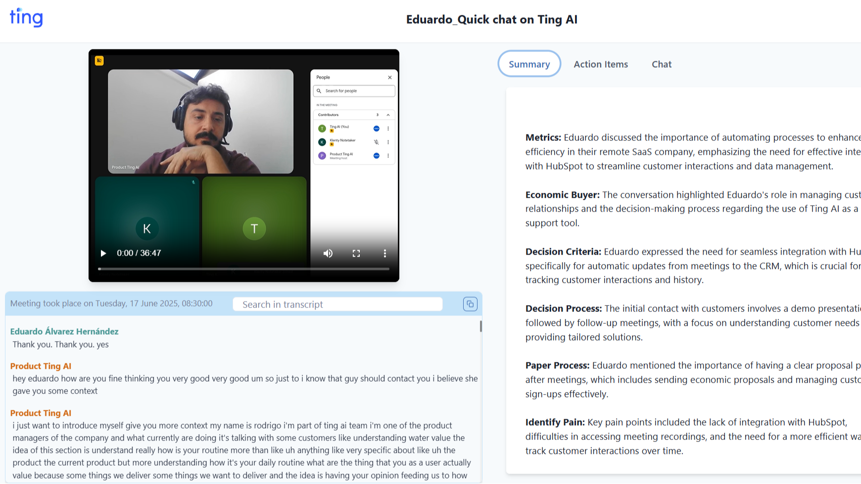 With its HubSpot integration, Ting enables users to effortlessly capture and sync AI-generated meeting summaries directly into HubSpot. This eliminates manual data entry, improves CRM accuracy, and ensures your deal records are always up to date.