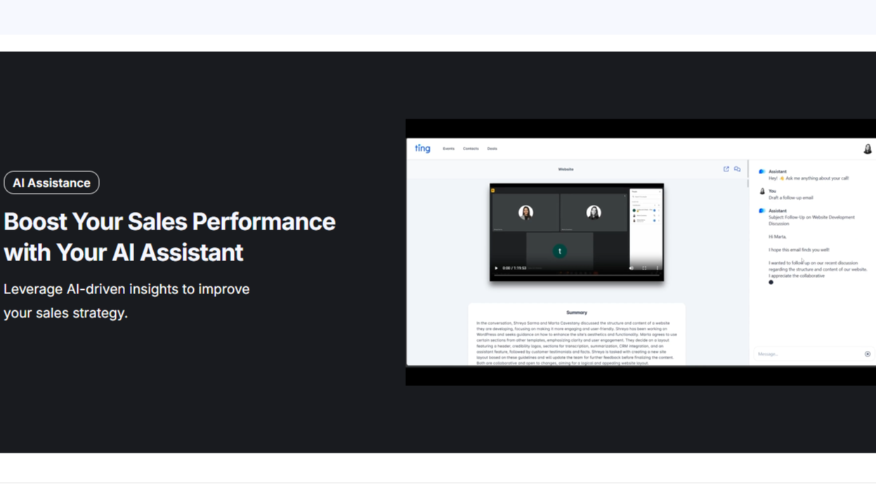 Ting is a free AI-powered meeting assistant that automatically records, transcribes, and summarizes your conversations on Zoom, Google Meet, or Microsoft Teams—so you can stay focused on the discussion, not the note-taking.