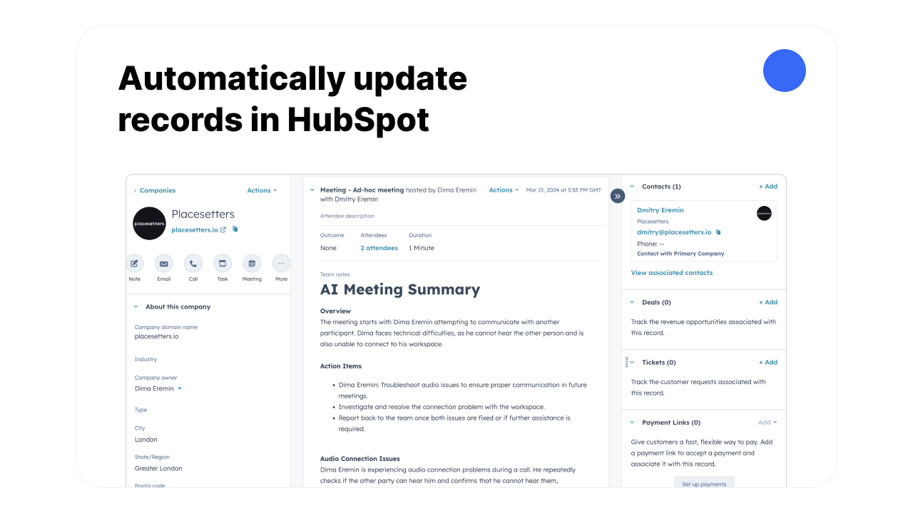 With Bluedot's HubSpot integration activated, keeping your contact's deal notes fresh and informative becomes a breeze! The integration brings AI-generated notes directly into your deals, complete with handy clickable timestamps. This means you can easily jump right into the details that matter or highlight key moments in no time at all.