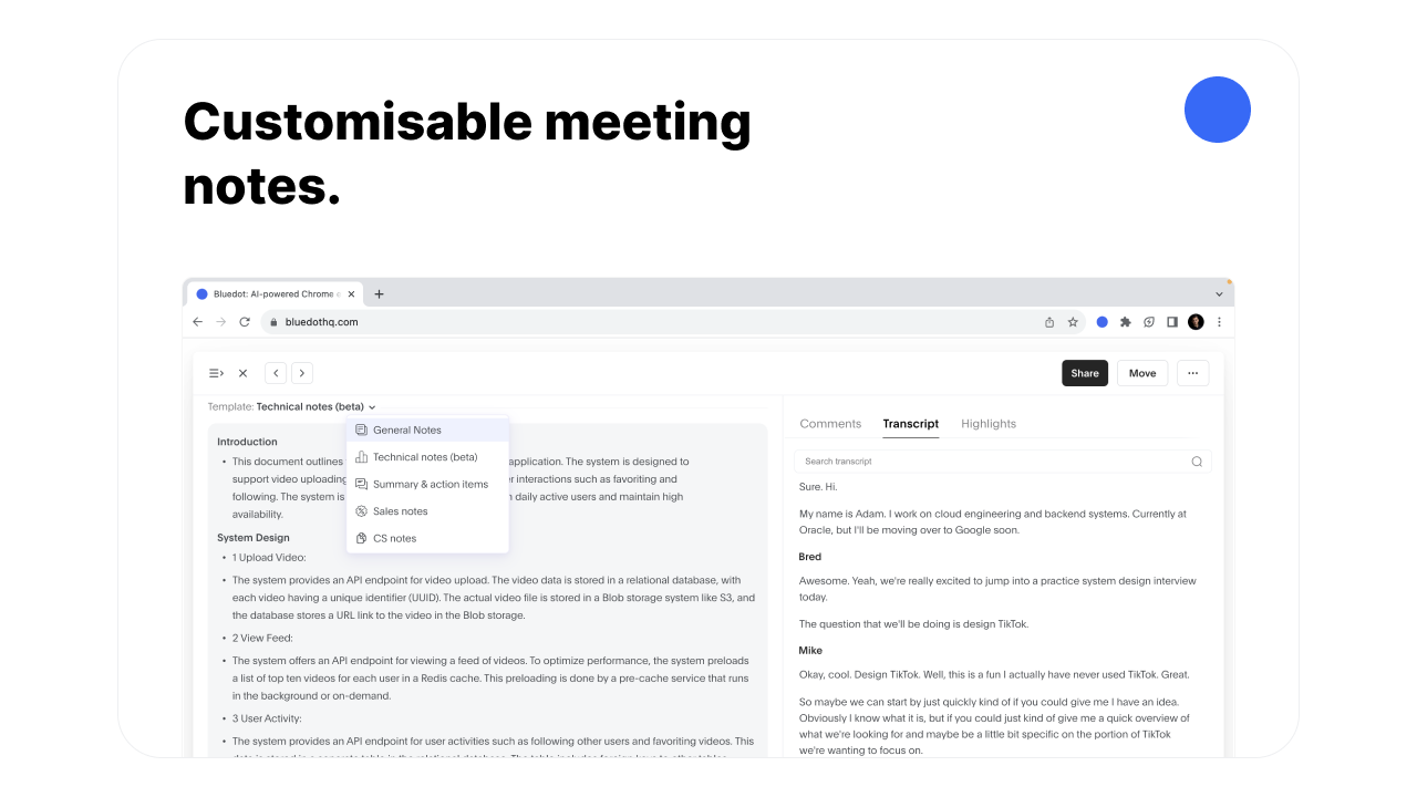 With Bluedot you can record meetings without a bot joining your calls and uses AI to generate meeting notes and follow-ups.