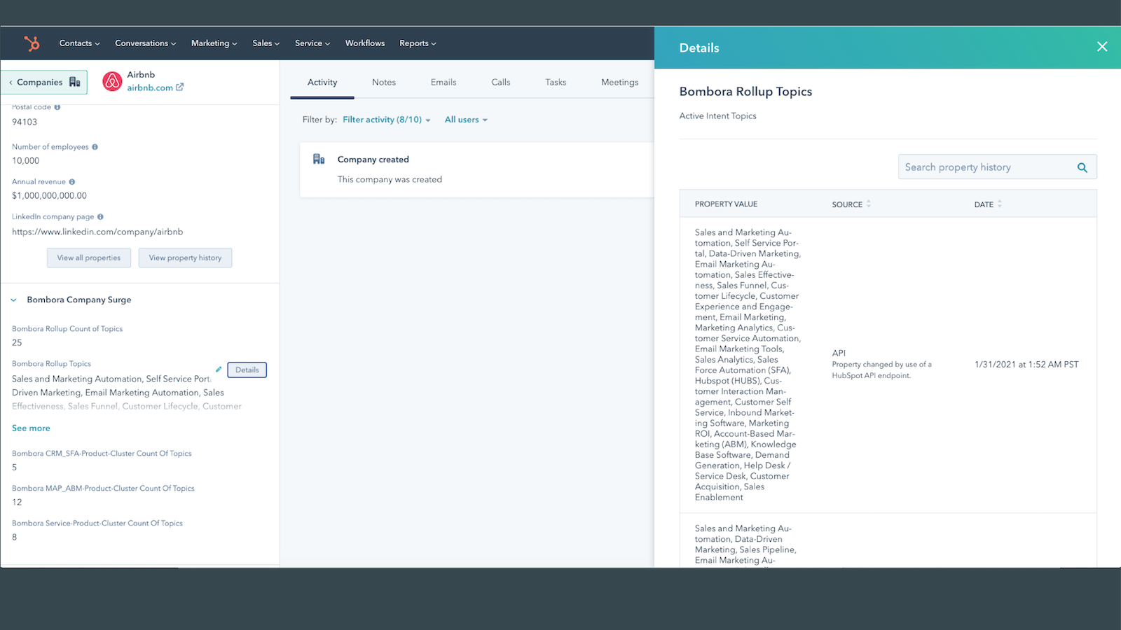 Activating Company Surge® in HubSpot is as easy as clicking a 'connect' button and selecting your Intent topics and clusters. Company Surge® Intent data auto updates your HubSpot database on a weekly basis with information on which target businesses are interested in your products or services.