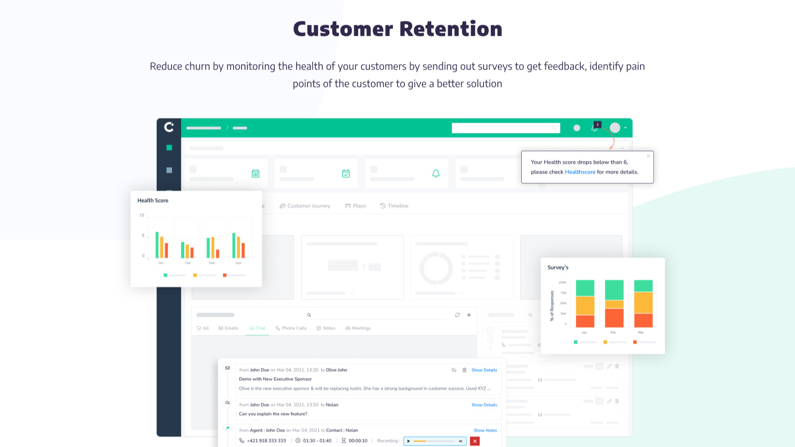 - Configure and manage healthscore based on product usage, campaign scores, subscription info to assess the health of the customer.
