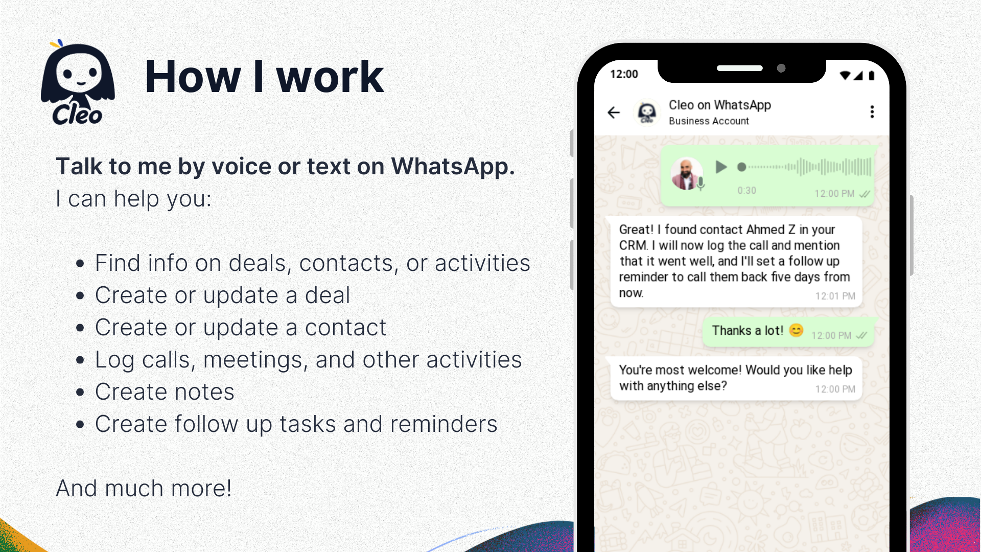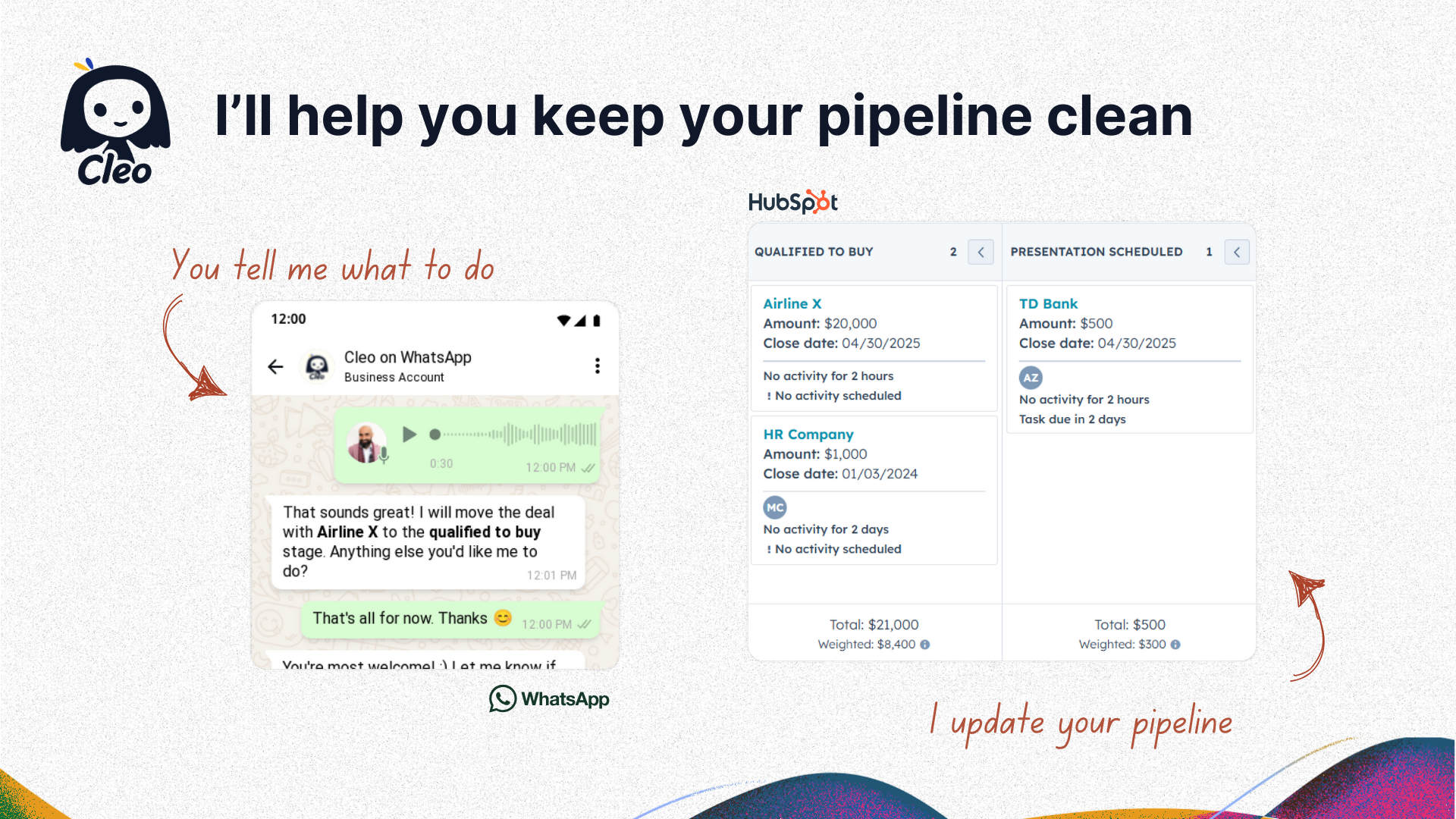 Cleo connects to your HubSpot account, allowing you to manage your CRM tasks using simple text or voice commands, right from the chat app you use all day.