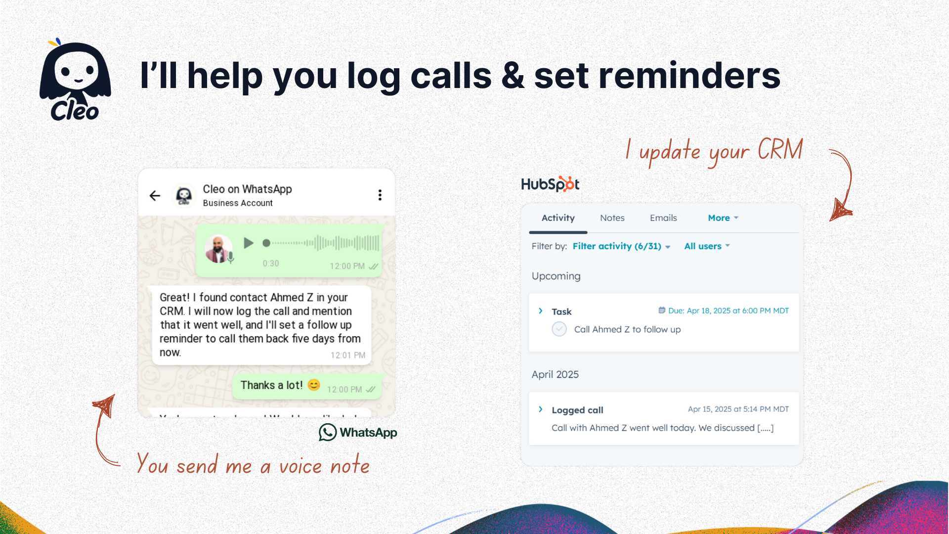 Capture important details while they're fresh. Simply send Cleo a text or voice note summarizing your call or meeting ("Log call with Bob, discussed Q3 budget...") and it's instantly logged on the correct HubSpot timeline.