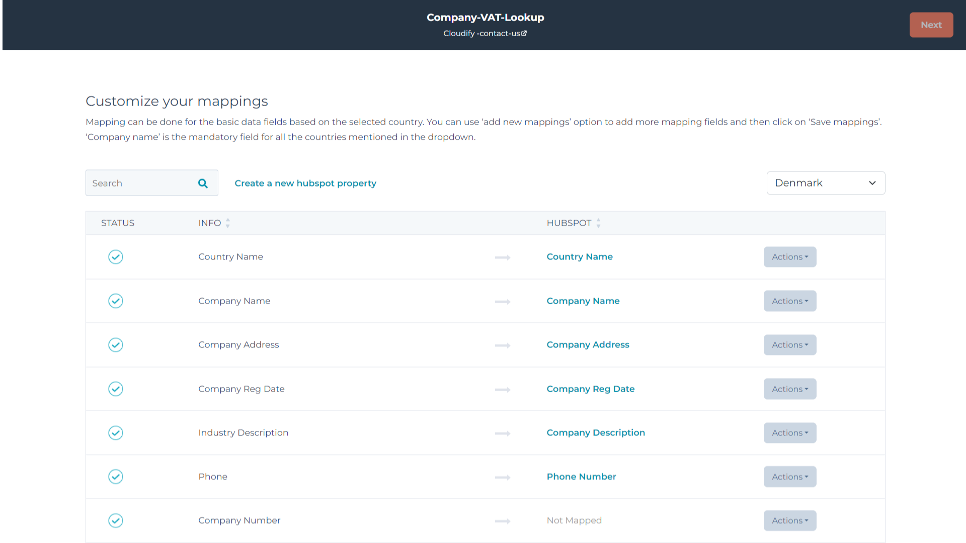 Use the mapping window from the CRM card to customise how you want your data to sync from the VAT Lookup app to your HubSpot company details. It also allows you to create and add new fields according to your preference.