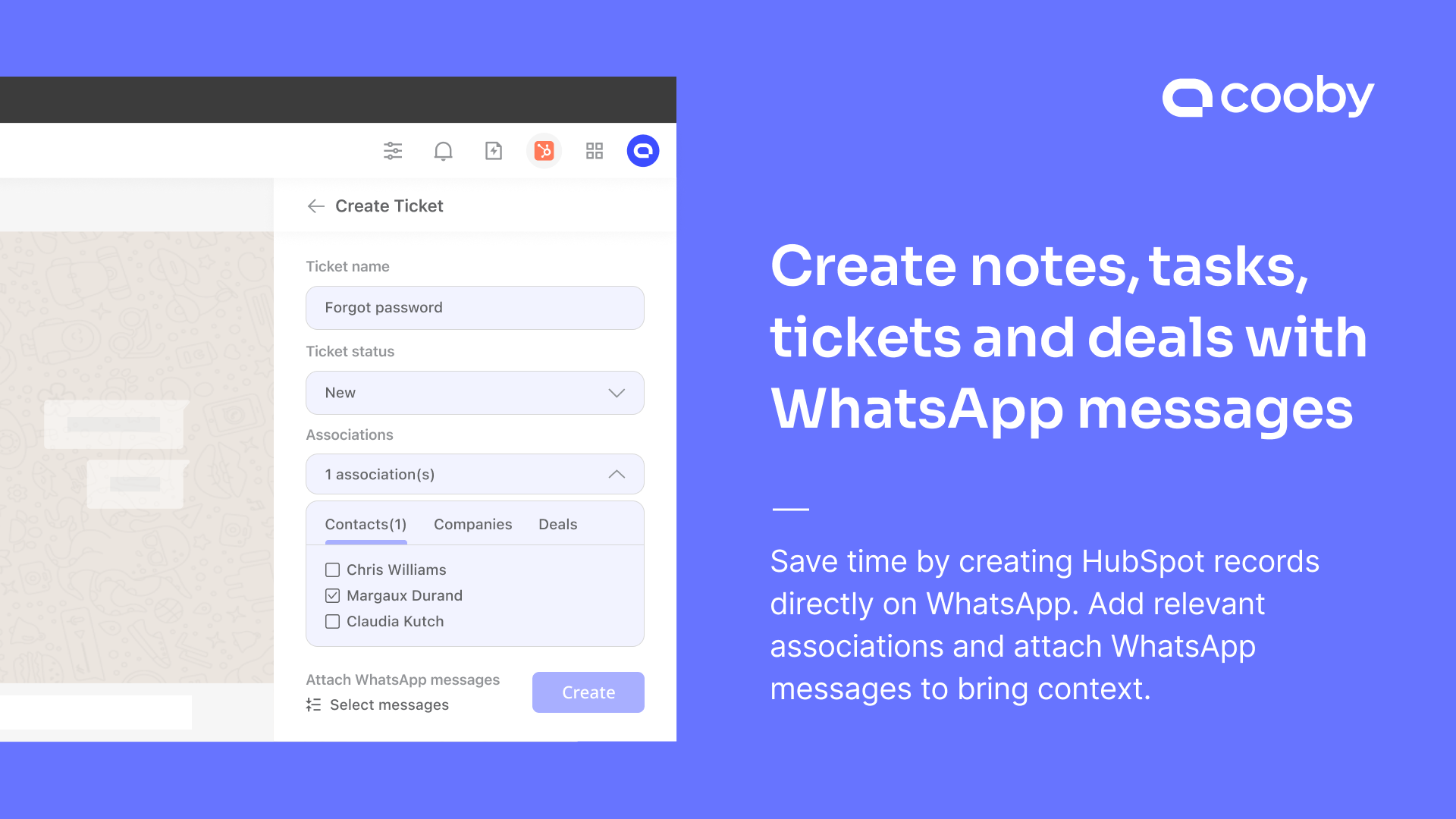 Save hours per day by creating HubSpot records directly on WhatsApp. Add relevant associations and attach WhatsApp messages to bring context to your team.
