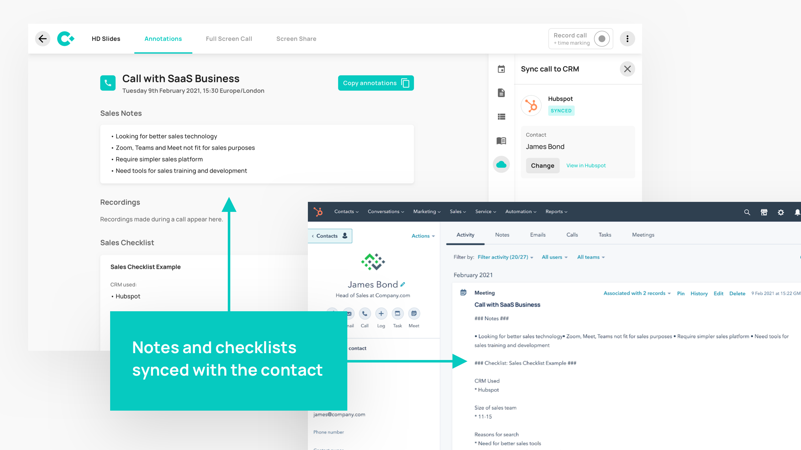 Simplify sales meetings with Crikle’s HubSpot automation. Meetings are logged automatically to the contact and all meeting notes, sales checklists, recordings and annotations made on Crikle are live synced to HubSpot. No more extra admin required after each sales meeting.