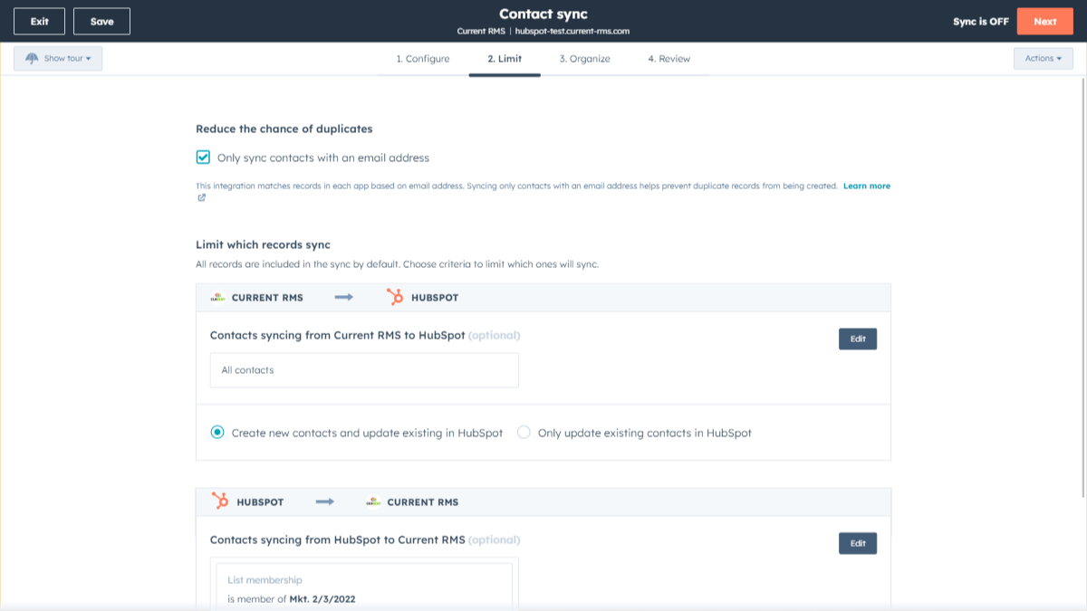 You’re in control of your data. You can set up a one- or two-way sync, which means you can either sync data from only one app to the other or back-and-forth between both apps. You can also add a filter for any Current RMS field (like status) or HubSpot list to sync exactly what you want—and nothing you don’t.