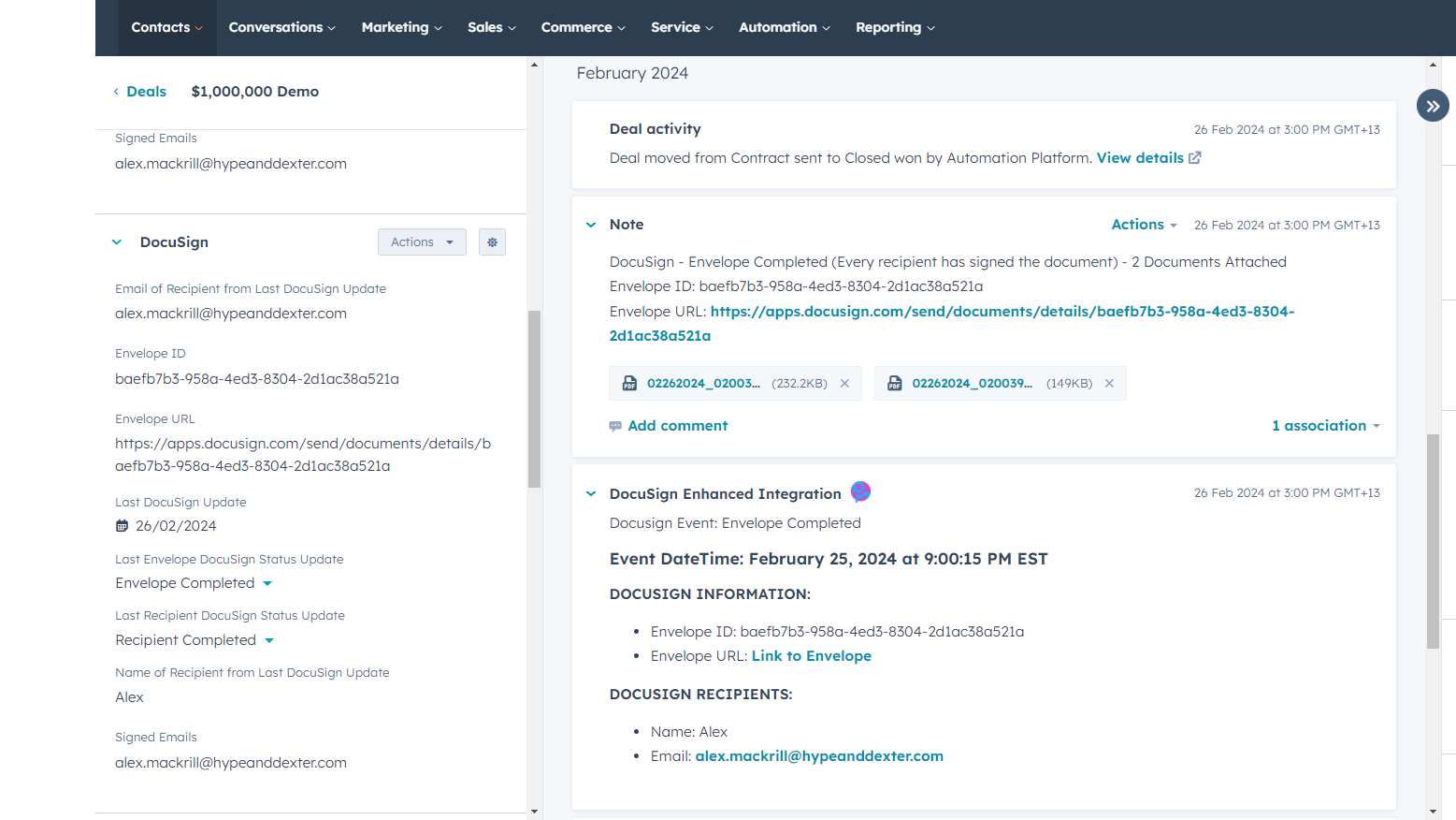 The integration will automatically give you all the properties you need to manage your Docusign process via HubSpot. And changes to these are updated automatically on the relevant object record.