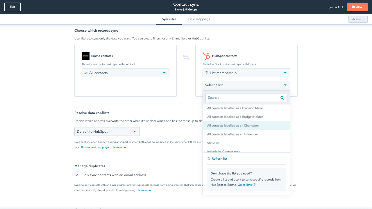 You’re in control of your data. You can set up a one- or two-way sync, which means you can either sync data from only one app to the other or back-and-forth between both apps. You can also add a filter for any field (like groups) or HubSpot list to sync exactly what you want—and nothing you don’t.