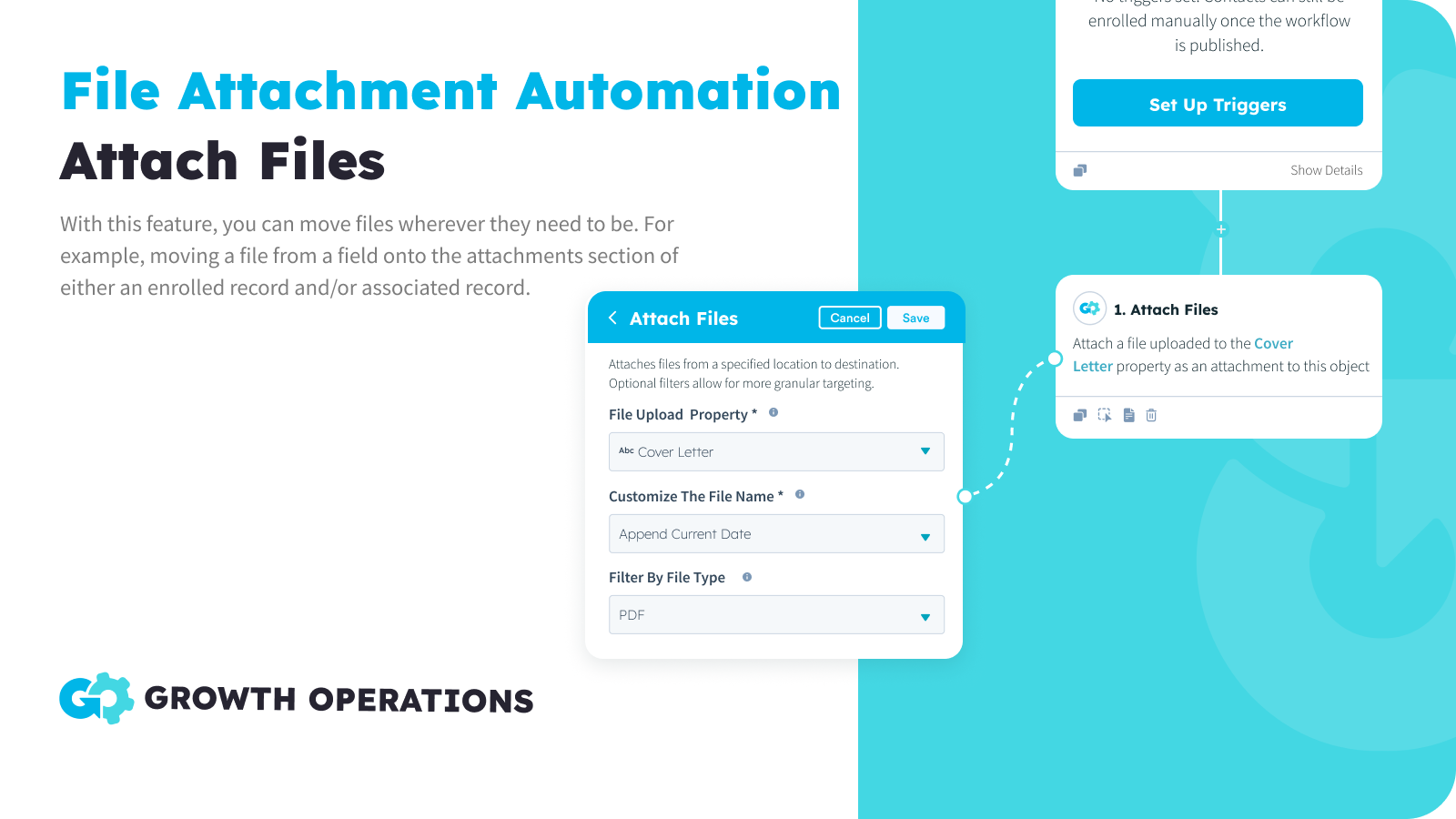 Migrate Files To HubSpot. The Attach Files action allows you to pull file(s) from the central HubSpot File Manager. With dynamic targeting options, this makes it possible to effectively migrate files into the file manager, then onto specified CRM records using a matching key.