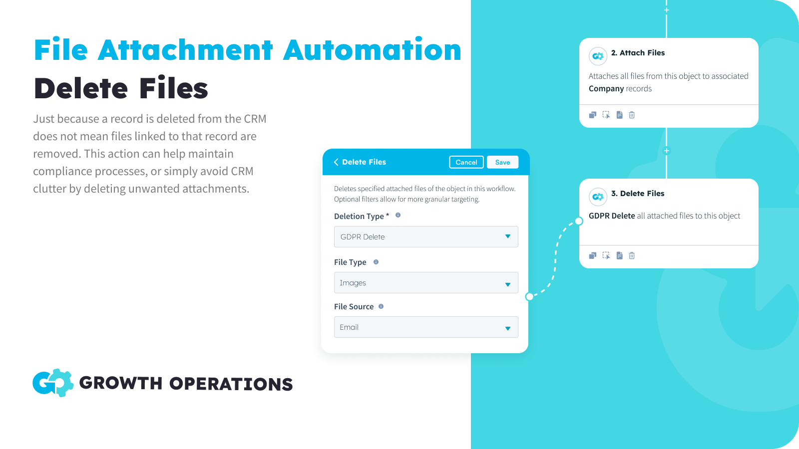 Remove Unwanted Files. Get rid of the files you don't want to see on a record. Advanced targeting allows you to filter on file source, file type, file name, as well as a files create date. These filters can be combined, so if you wanted to target logos/headshots copied in from HubSpot's email extension, you could combine "File Source = Email" and "File Type = Image" together.