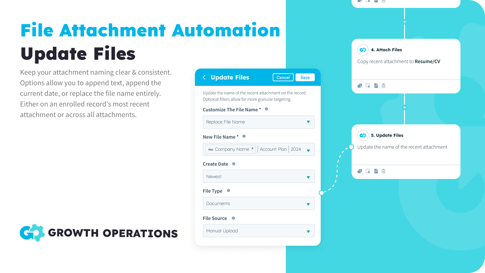 Keep your attachment naming clear & consistent. Options allow you to append text, append the current date, or replace the file name entirely. Advanced filters allow you to target specific files located on the enrolled record, and refine which are updated based on file source, file type, current name, or create date.