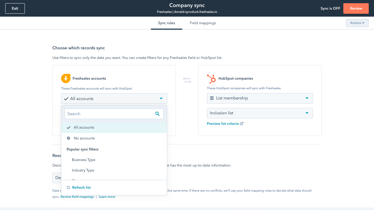 You’re in control of your data. You can set up a one- or two-way sync, which means you can either sync data from only one app to the other or back-and-forth between both apps. You can also add a filter for any Freshsales Classic field or HubSpot list to sync exactly what you want—and nothing you don’t.