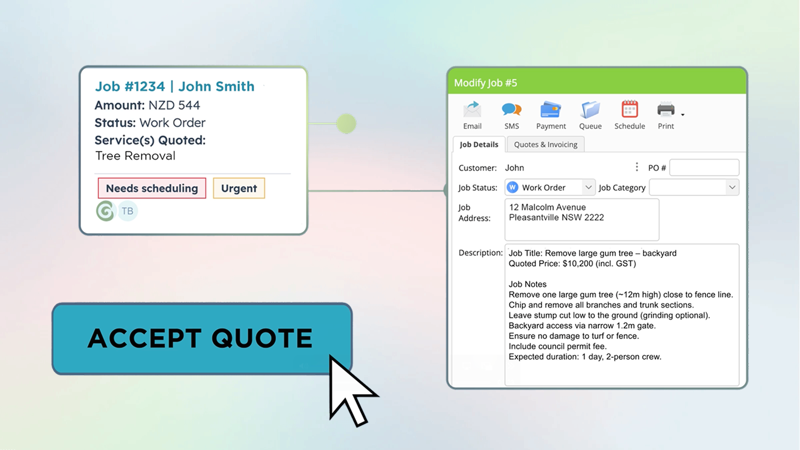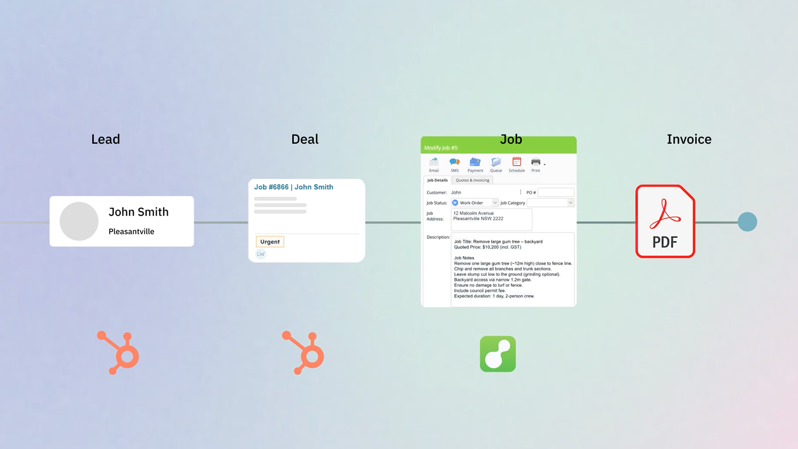 Get a complete view of your client’s journey inside HubSpot. See every job, invoice, and update in one place — from first enquiry to completed work — helping you deliver a consistent, professional experience for every customer.