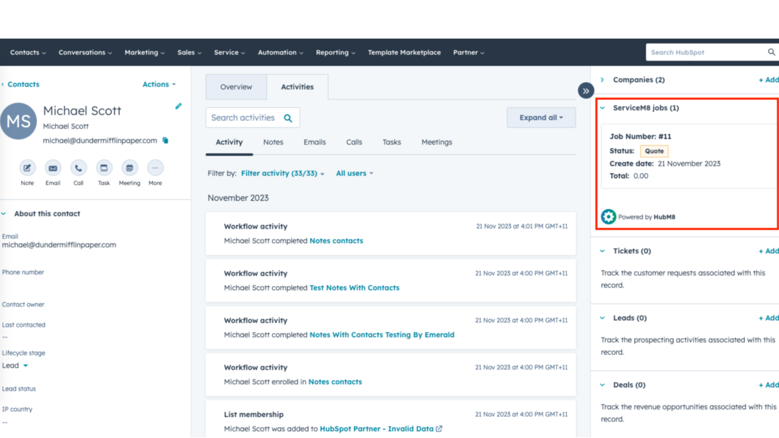 View ServiceM8 job status in HubSpot in our custom CRM card on the right hand side of any contact record.