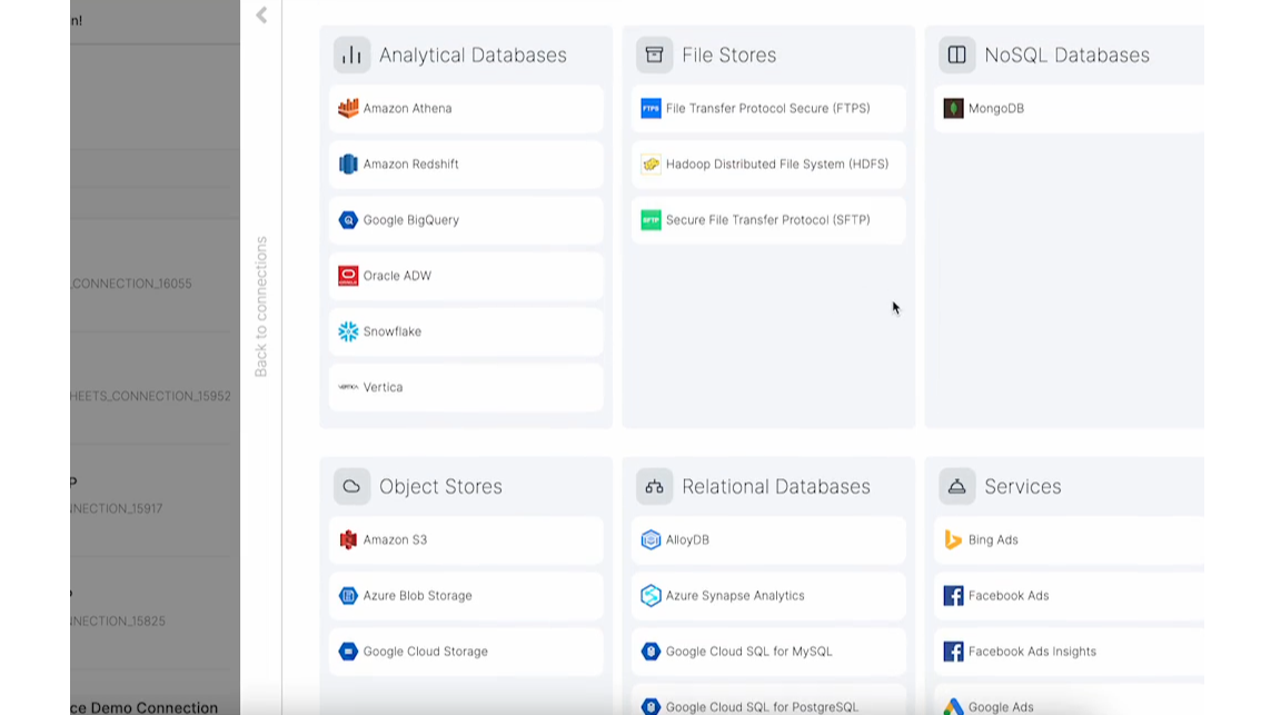 Integrate.io seamlessly connects with a vast array of data stores, making it easy to integrate all your critical data sources. Our supported data stores include: CSV SFTP Salesforce Data Warehouses Relational Databases NoSQL Data Stores Cloud Storage Web Services