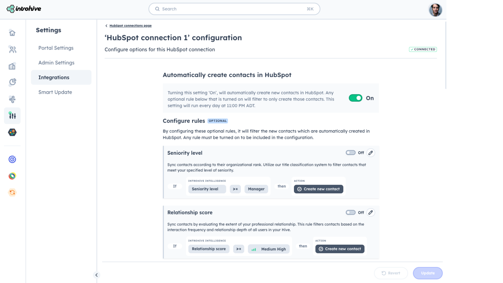 Automate the creation of new, discoverable contacts from Introhive into HubSpot utilizing a configurable set of rules. Set rules based on Relationship Score, Seniority Level, and more to ensure only the most valuable contacts get captured in HubSpot.