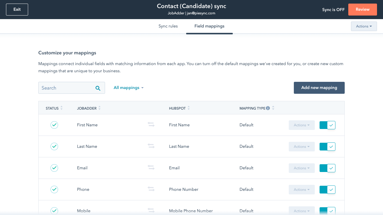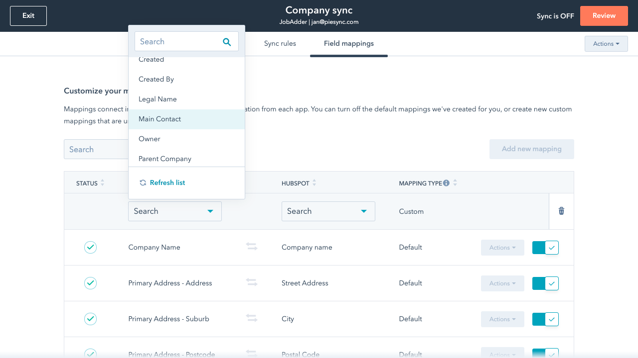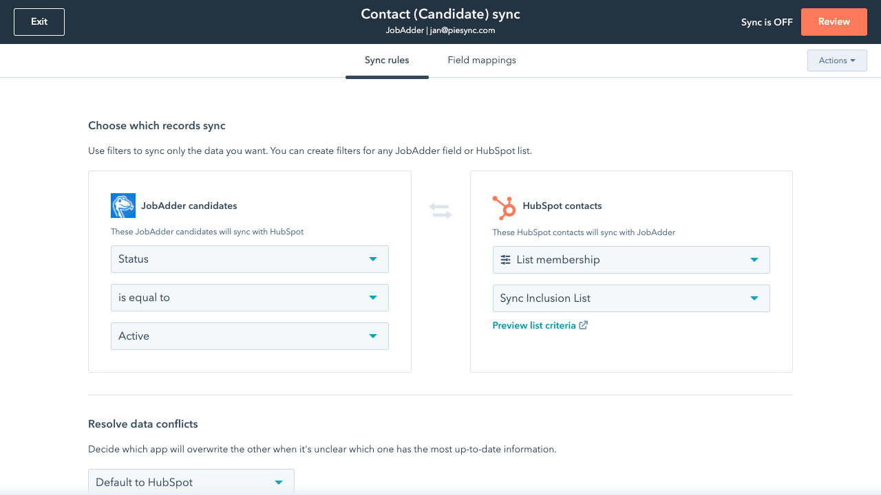 You’re in control of your data. You can set up a one- or two-way sync, which means you can either sync data from only one app to the other or back-and-forth between both apps. You can also add a filter for any JobAdder field (like Status) or HubSpot list to sync exactly what you want—and nothing you don’t.