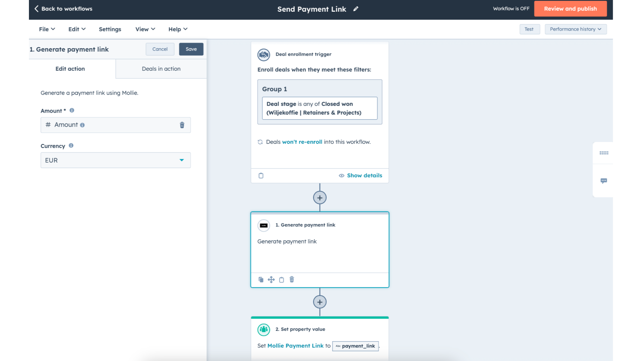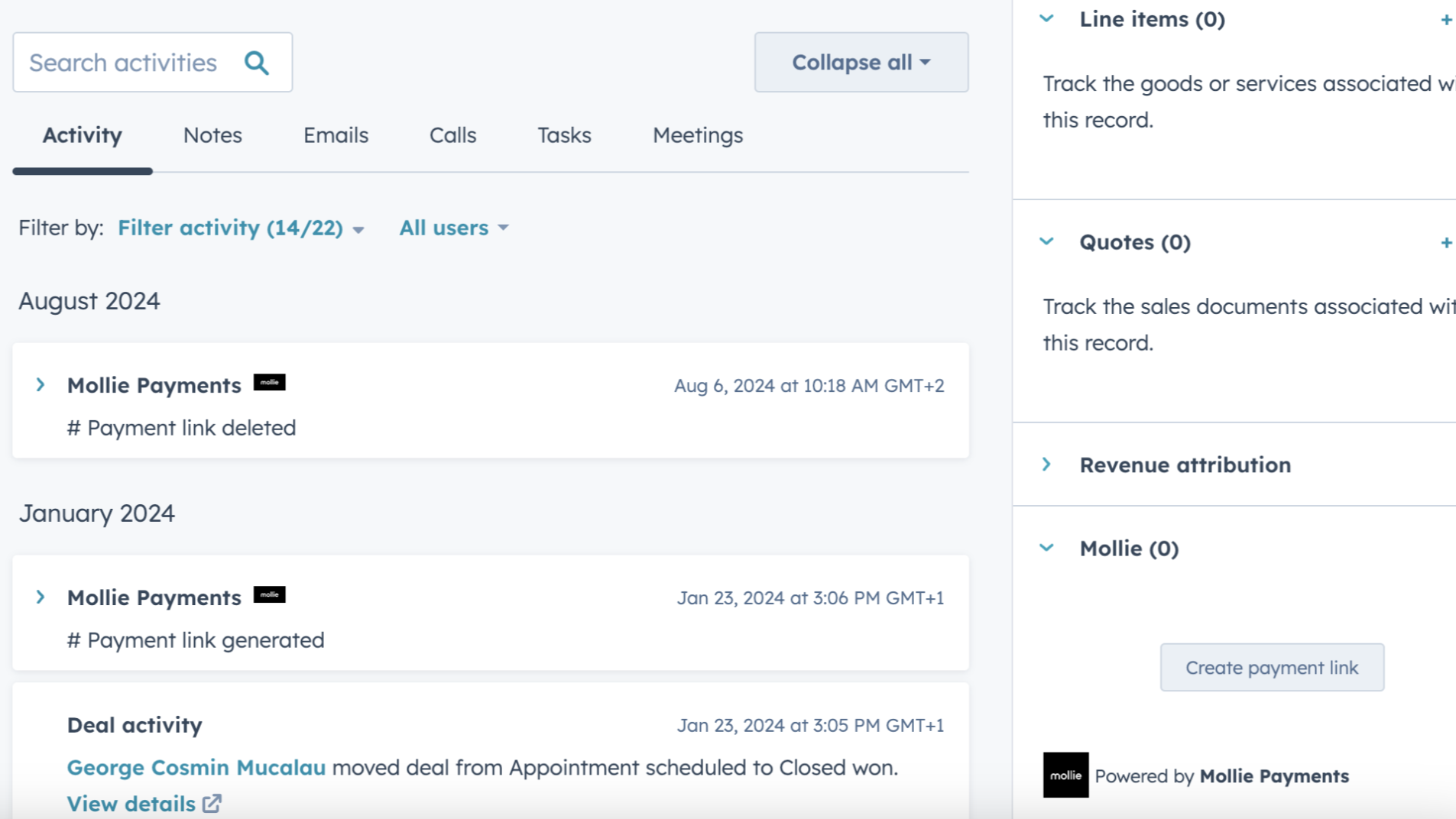 By integrating Mollie payments with HubSpot CRM, you can effortlessly create and send payment links for specific deals, manage customer transactions, and monitor their progress—all within the HubSpot interface.