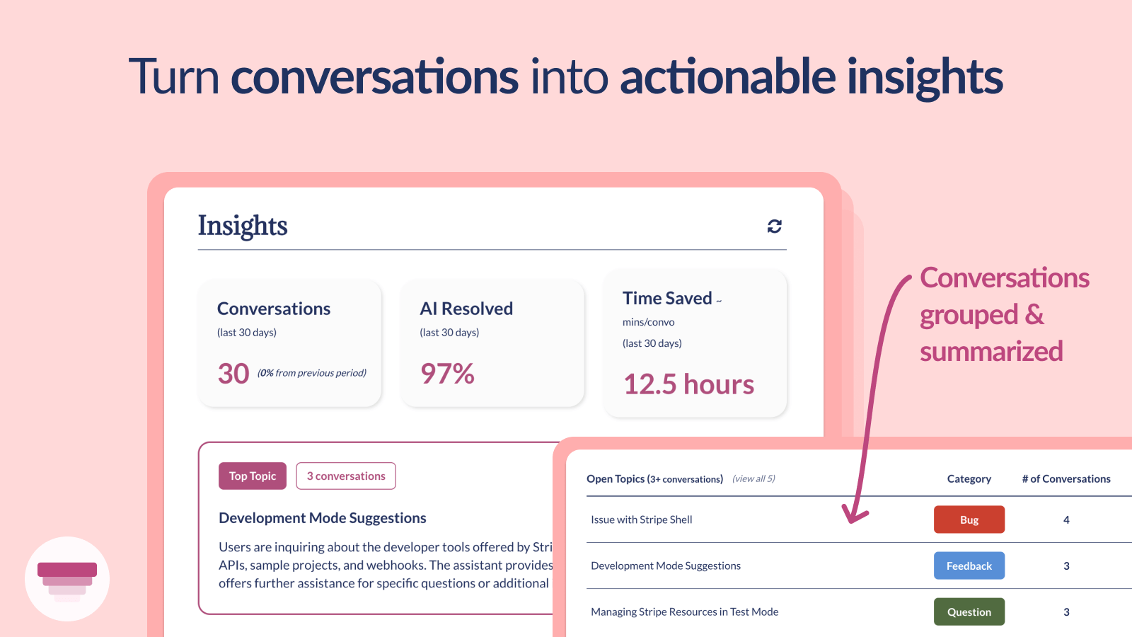 It's difficult to extract actionable insights from customer support conversations. Which makes it almost impossible to answer questions like: What are the most common support queries? Where do our help docs need improvements? My AskAI's AI agent converts each support conversation into a summarised insight, grouped with similar conversations.