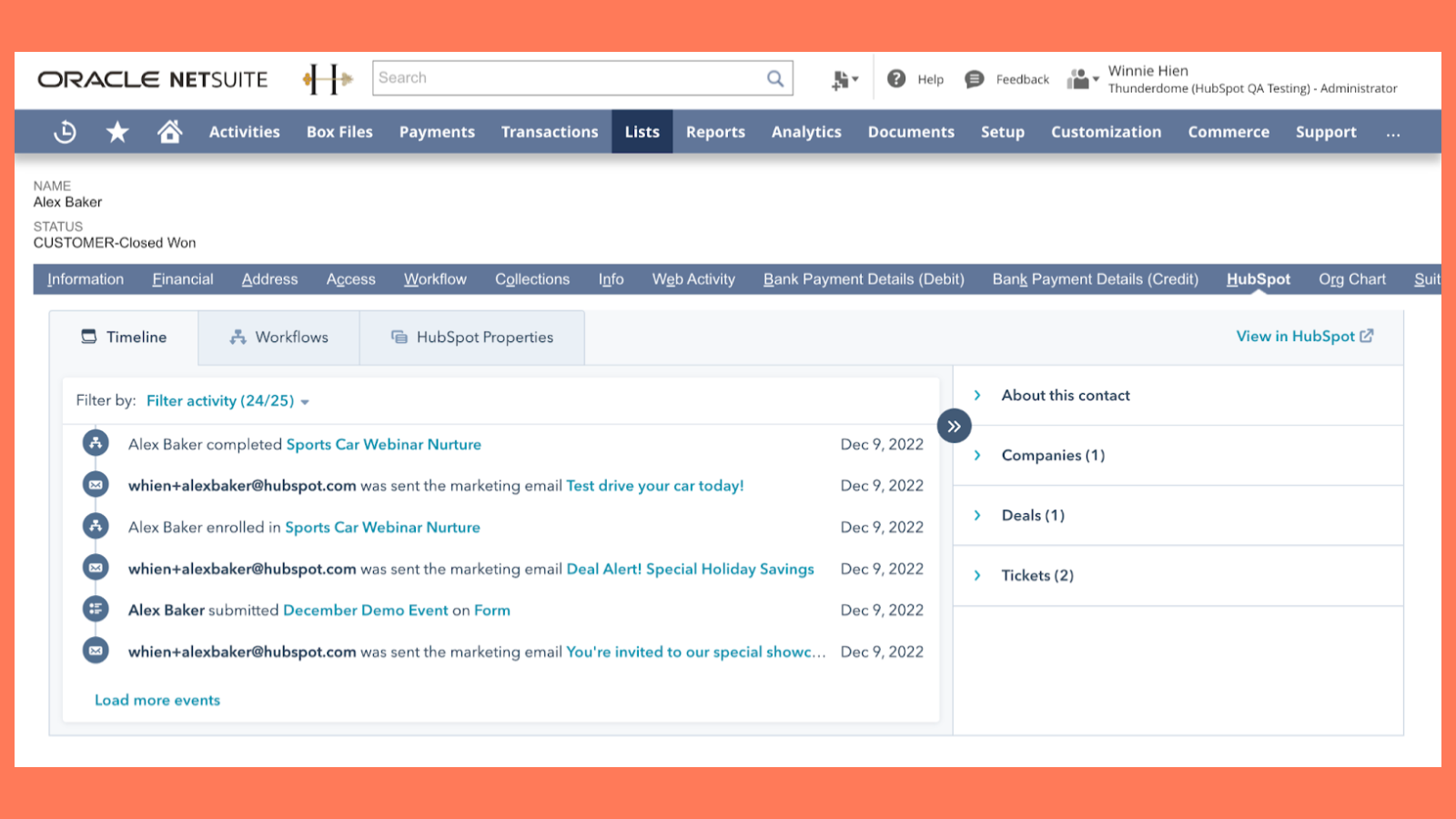 Utilize HubSpot tools without leaving NetSuite. The HubSpot embed feature provides insights into HubSpot contact, company, and deal records and lets you enroll these records in automation from right within NetSuite.