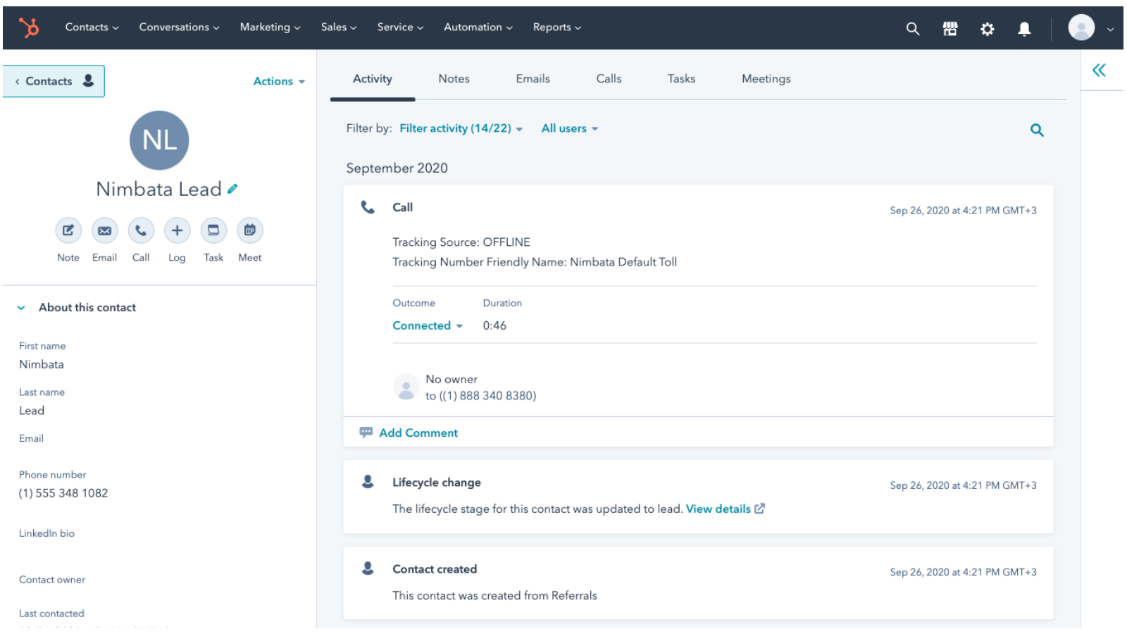 Nimbata's integration provides call tracking and analytics software that syncs call activity directly with HubSpot. The integration will automatically create a new contact in HubSpot for each unique caller in your Nimbata account. It will include valuable session information associated with the call such as the landing page, click id and more. The integration will also update the engagement feed for contacts or companies if the record already exists.
